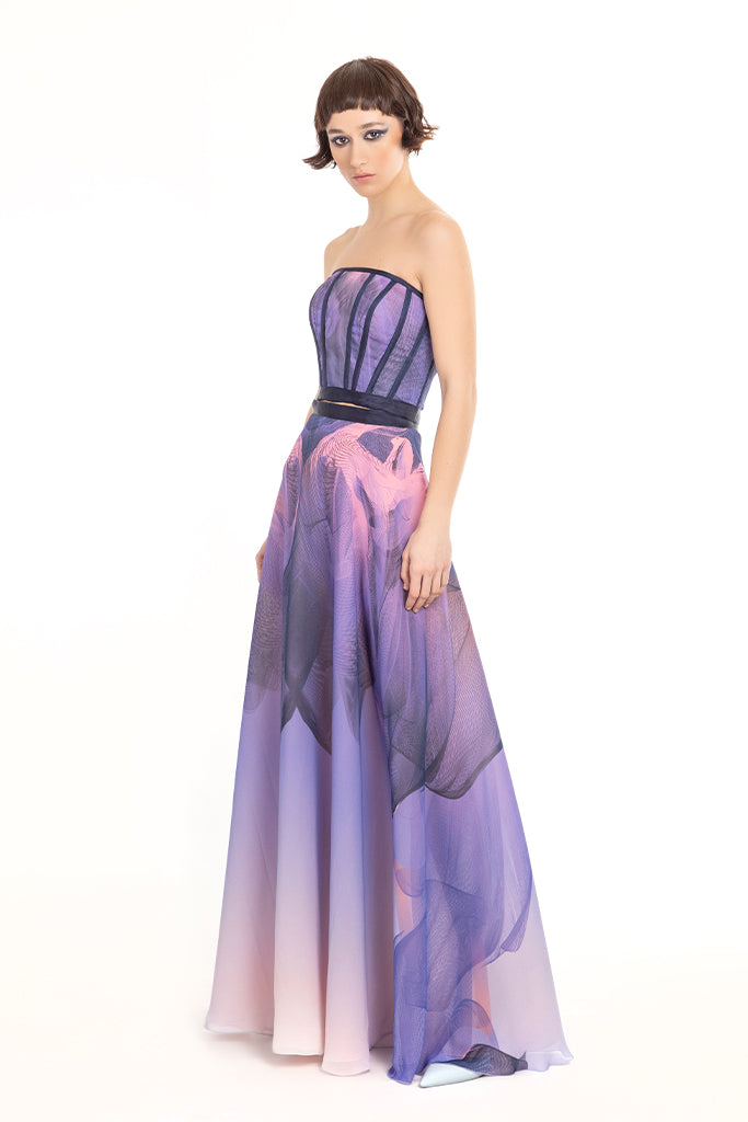 Belma Tvico has structured the Spring/Summer 2022 collection in several acts, taking up the theme of rebirth and art. At its core, the Metamorphosis revolves around the four elements of life- water, air, earth, and fire - and the concept of their cyclic renewal. This collection, like no other before, uncovers her fearlessness and a breakthrough aesthetic. It is an inventive body of work.