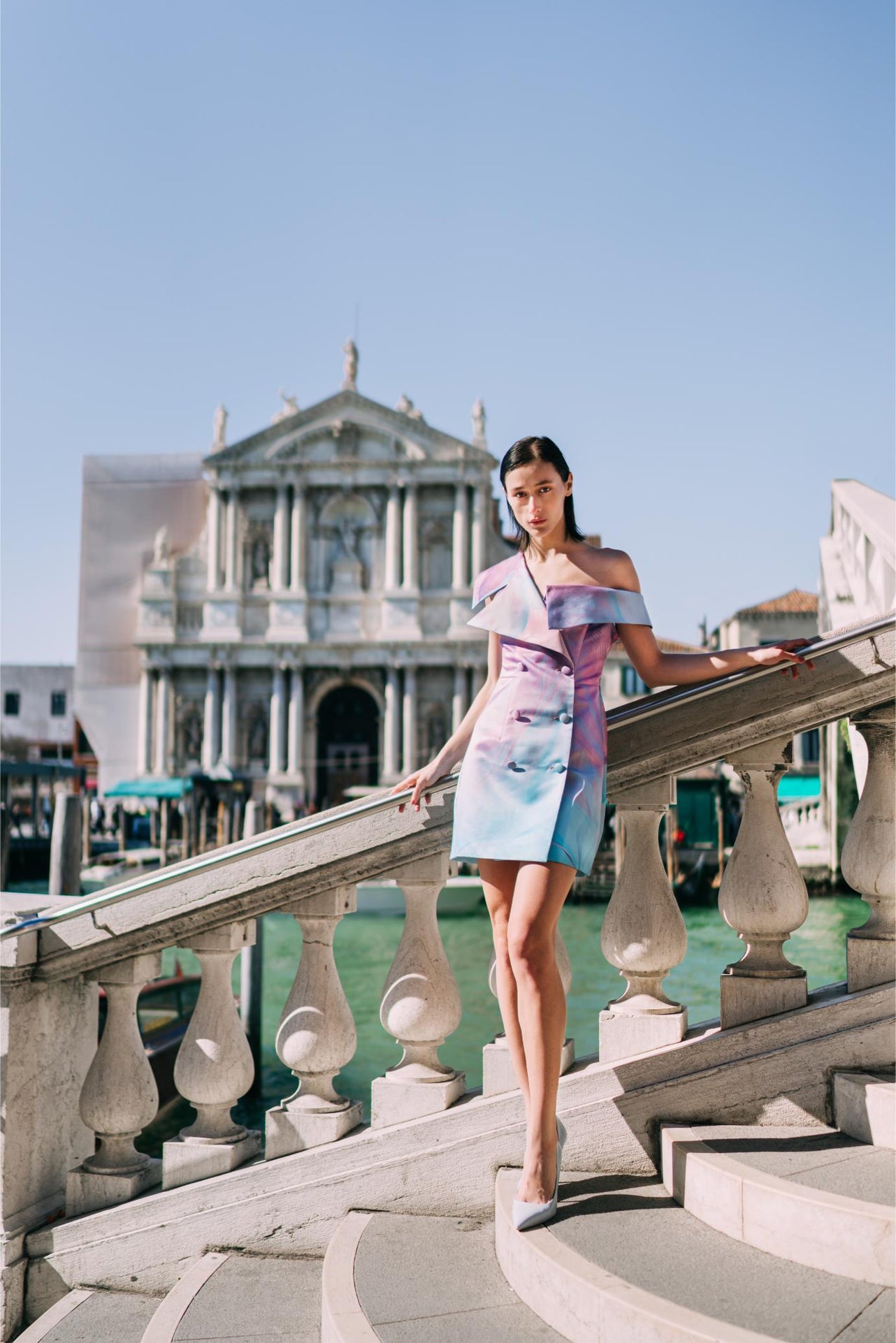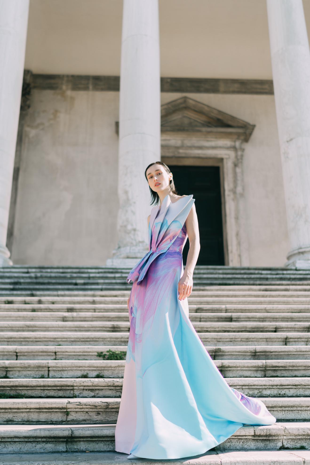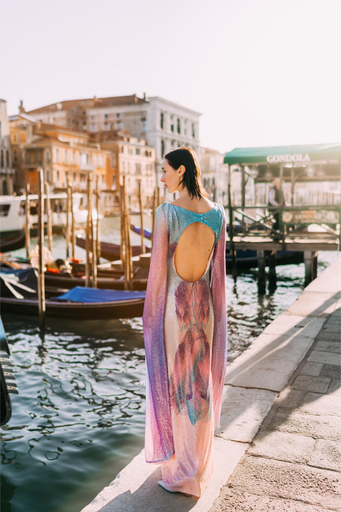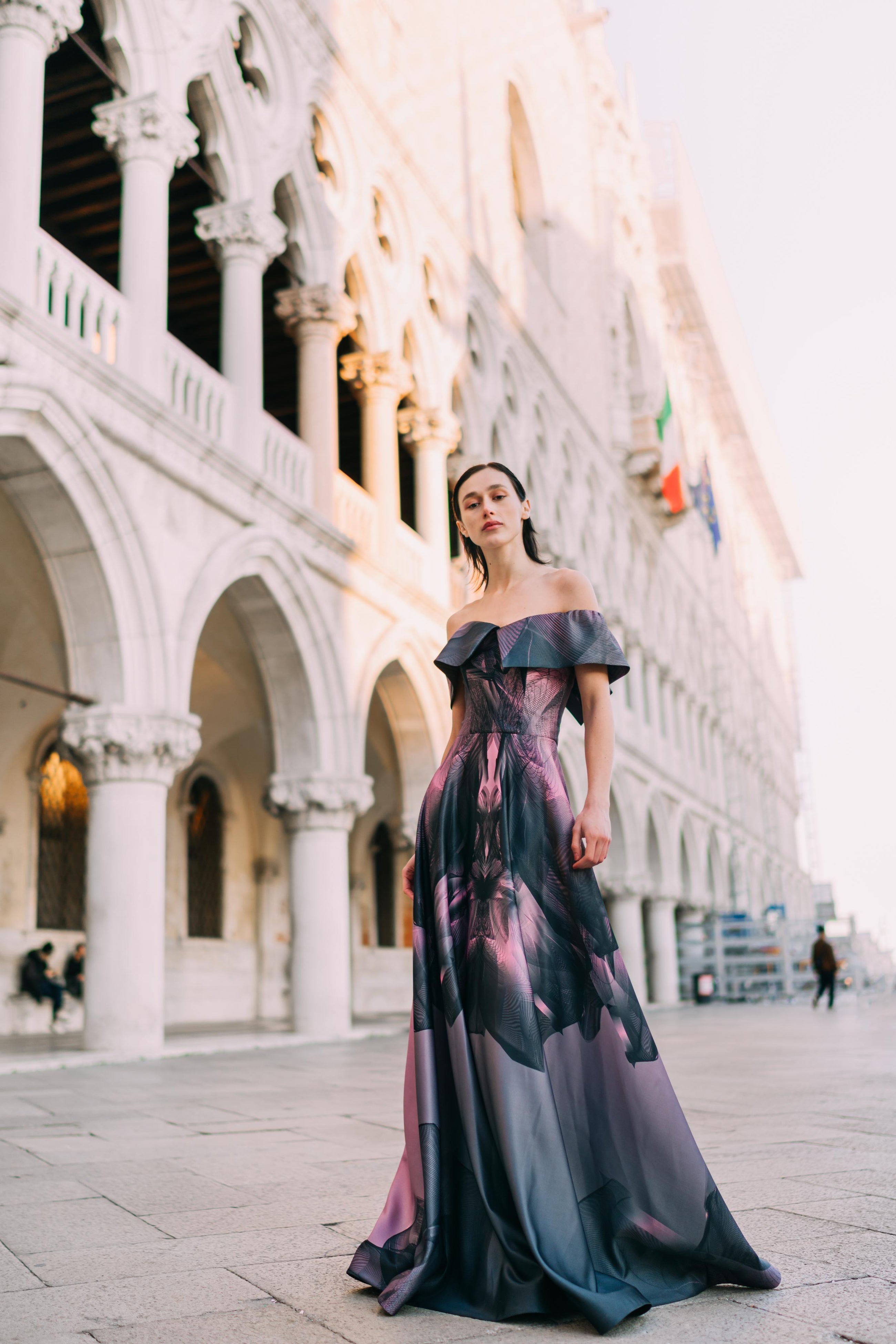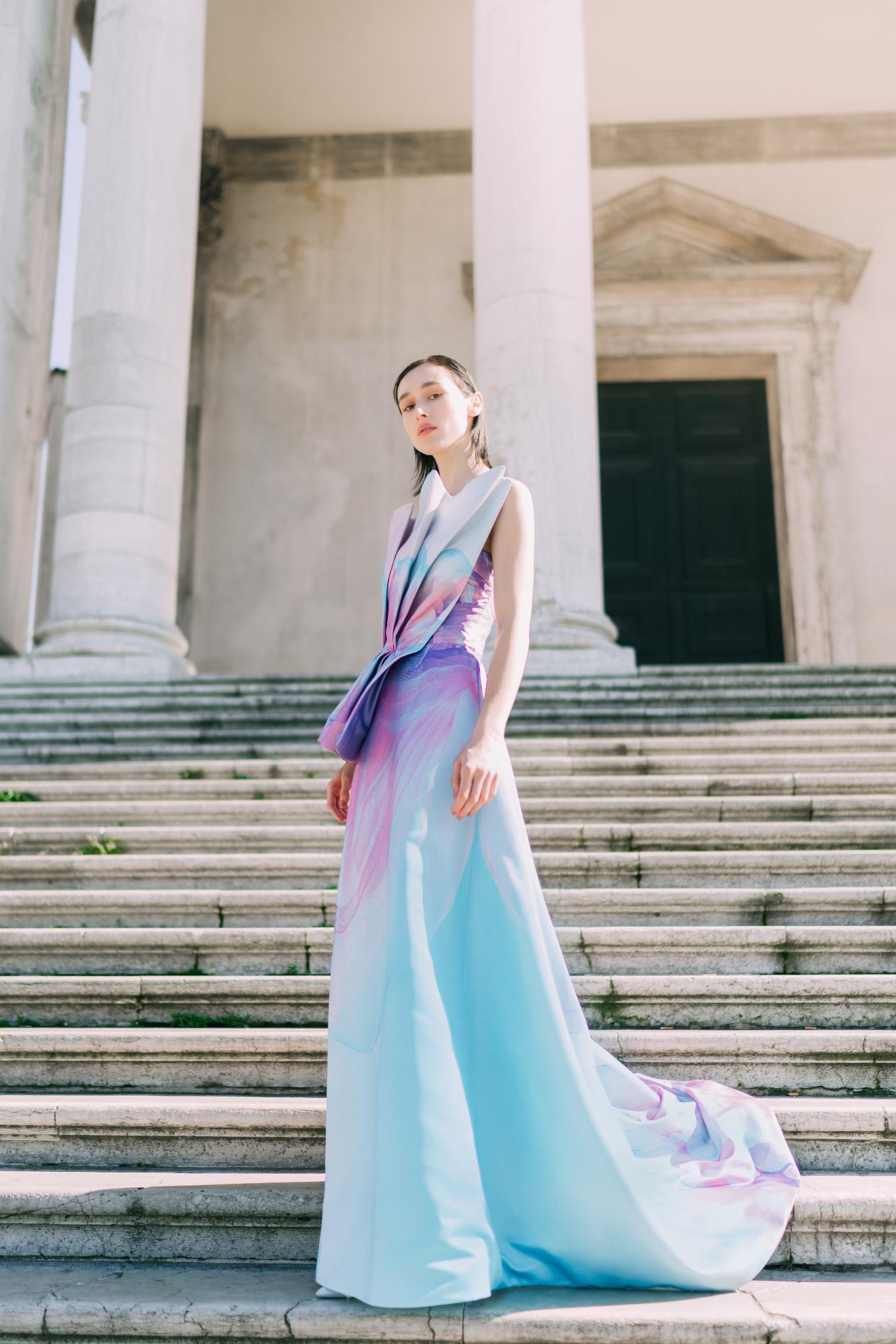 Inspired by the astronomical twilight, Belma Tvico premiered her new custom-designed print in the Spring/Summer 2023 semi couture collection, photographed in Venice. Through her work, Belma Tvico continually reconstruct the past into the postmodern present. The unrestrained movement and natural shapes mold into a high fashion.