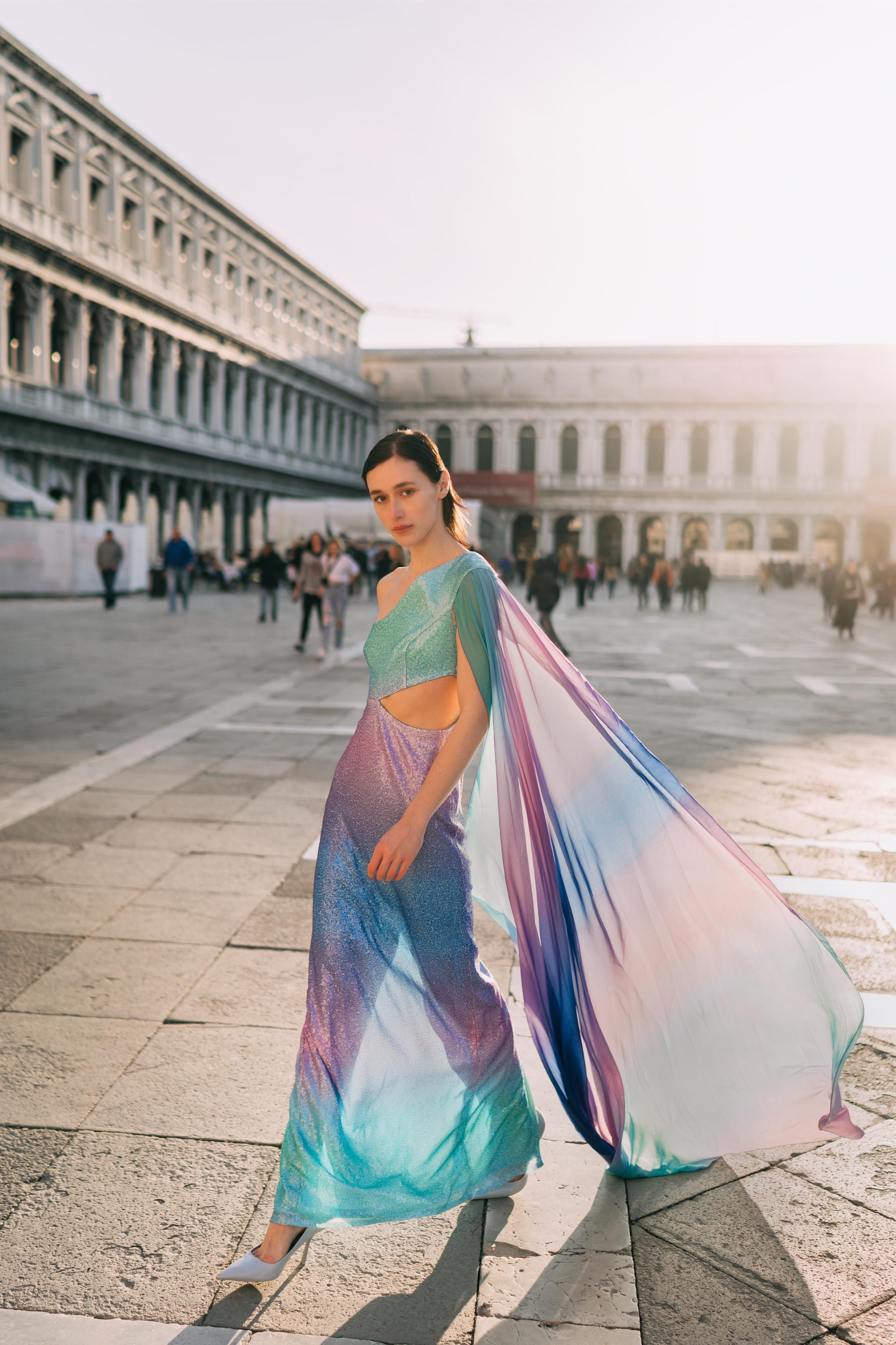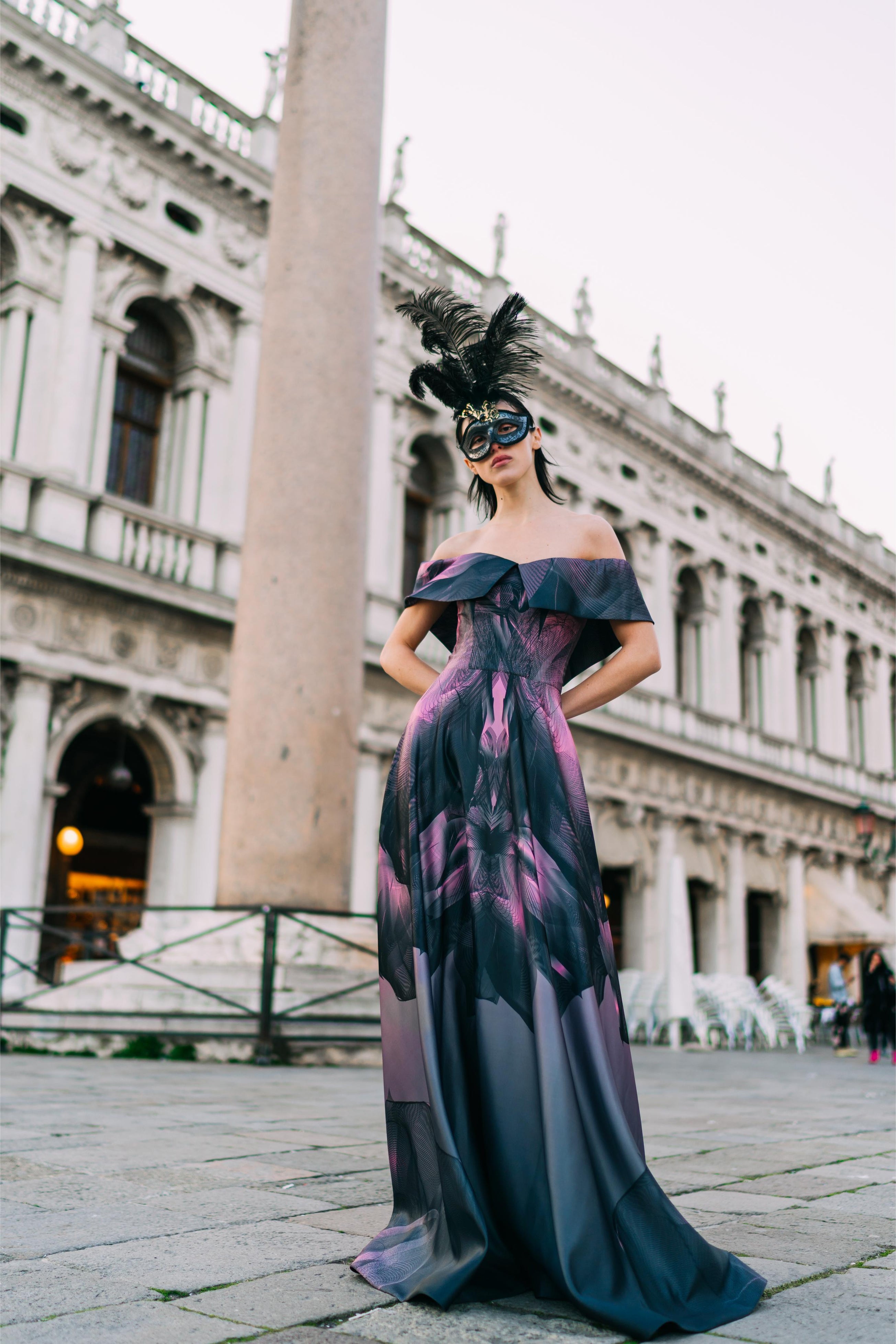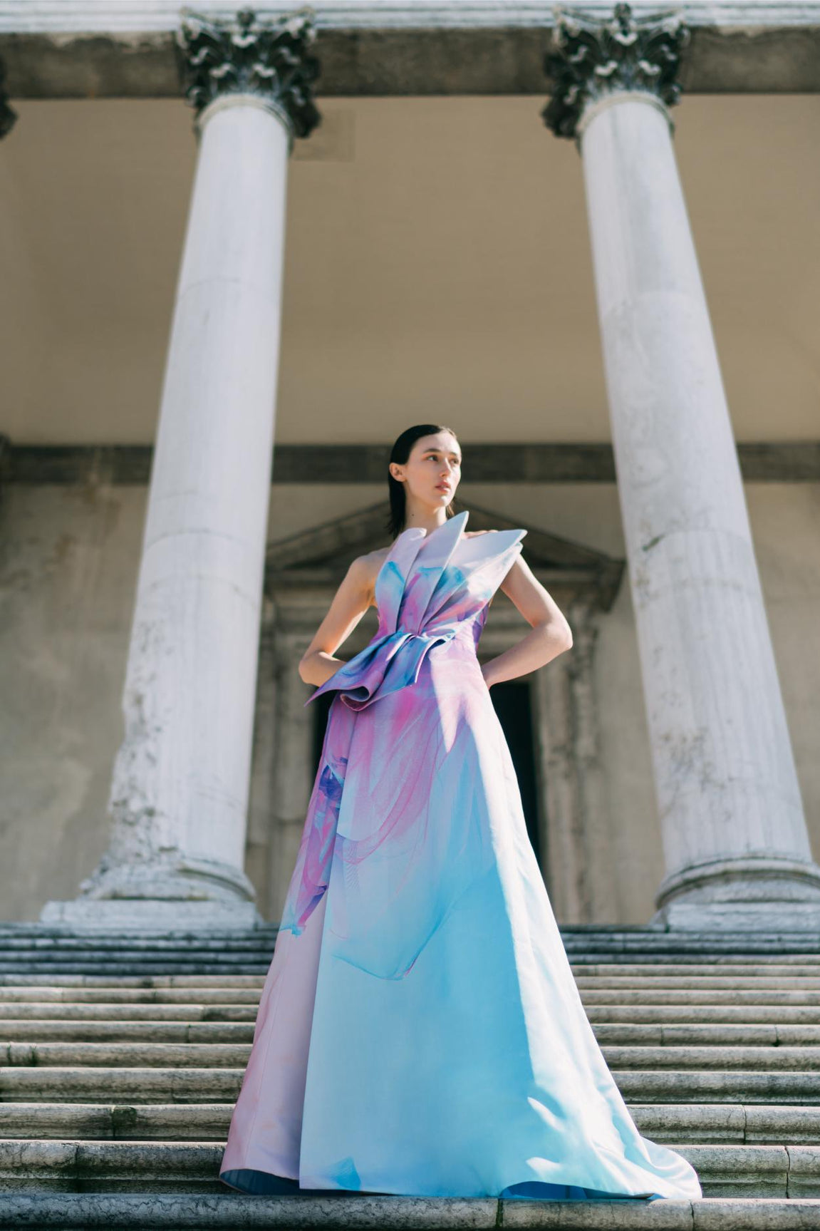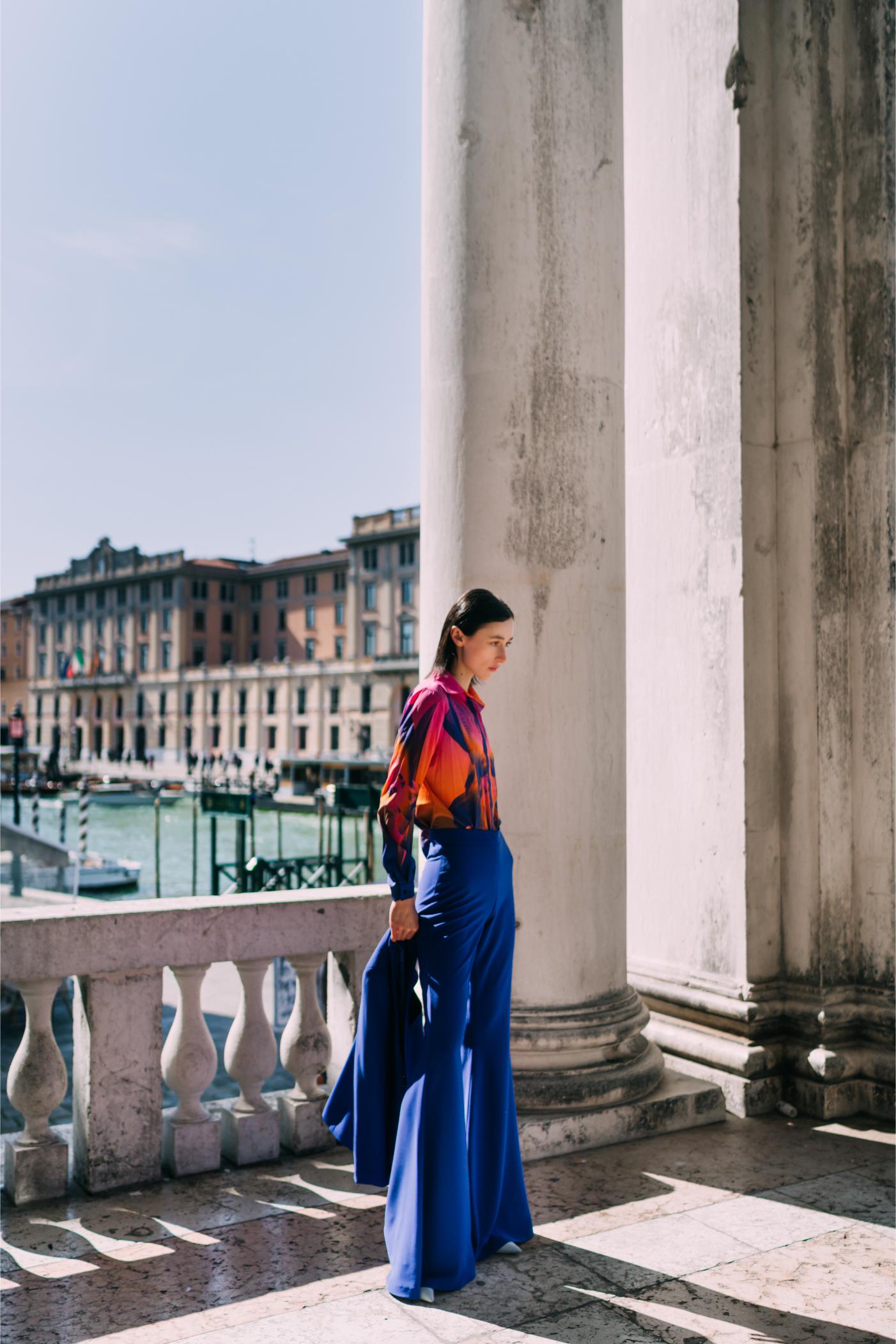 Inspired by the astronomical twilight, Belma Tvico premiered her new custom-designed print in the Spring/Summer 2023 semi couture collection, photographed in Venice. Through her work, Belma Tvico continually reconstruct the past into the postmodern present. The unrestrained movement and natural shapes mold into a high fashion.