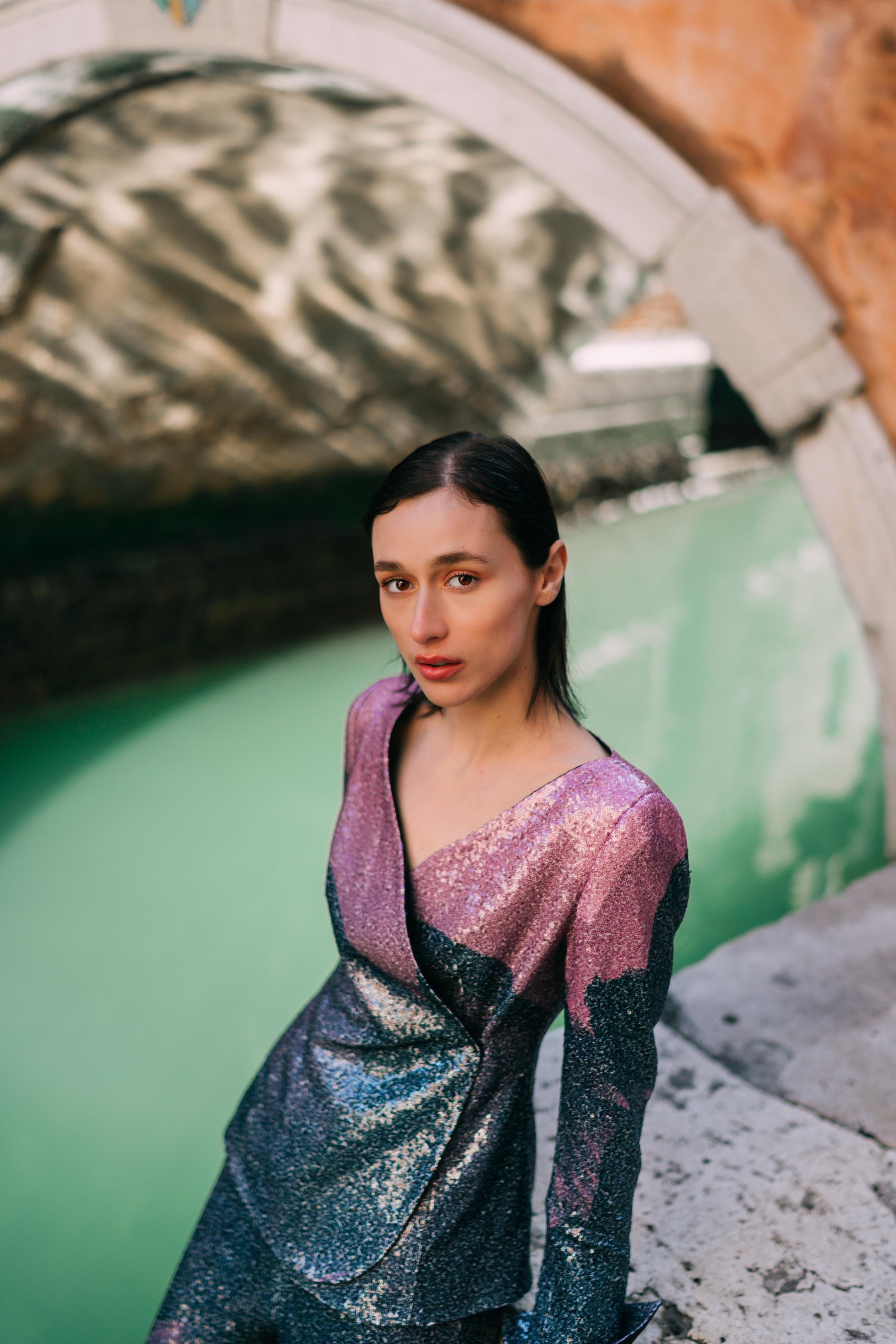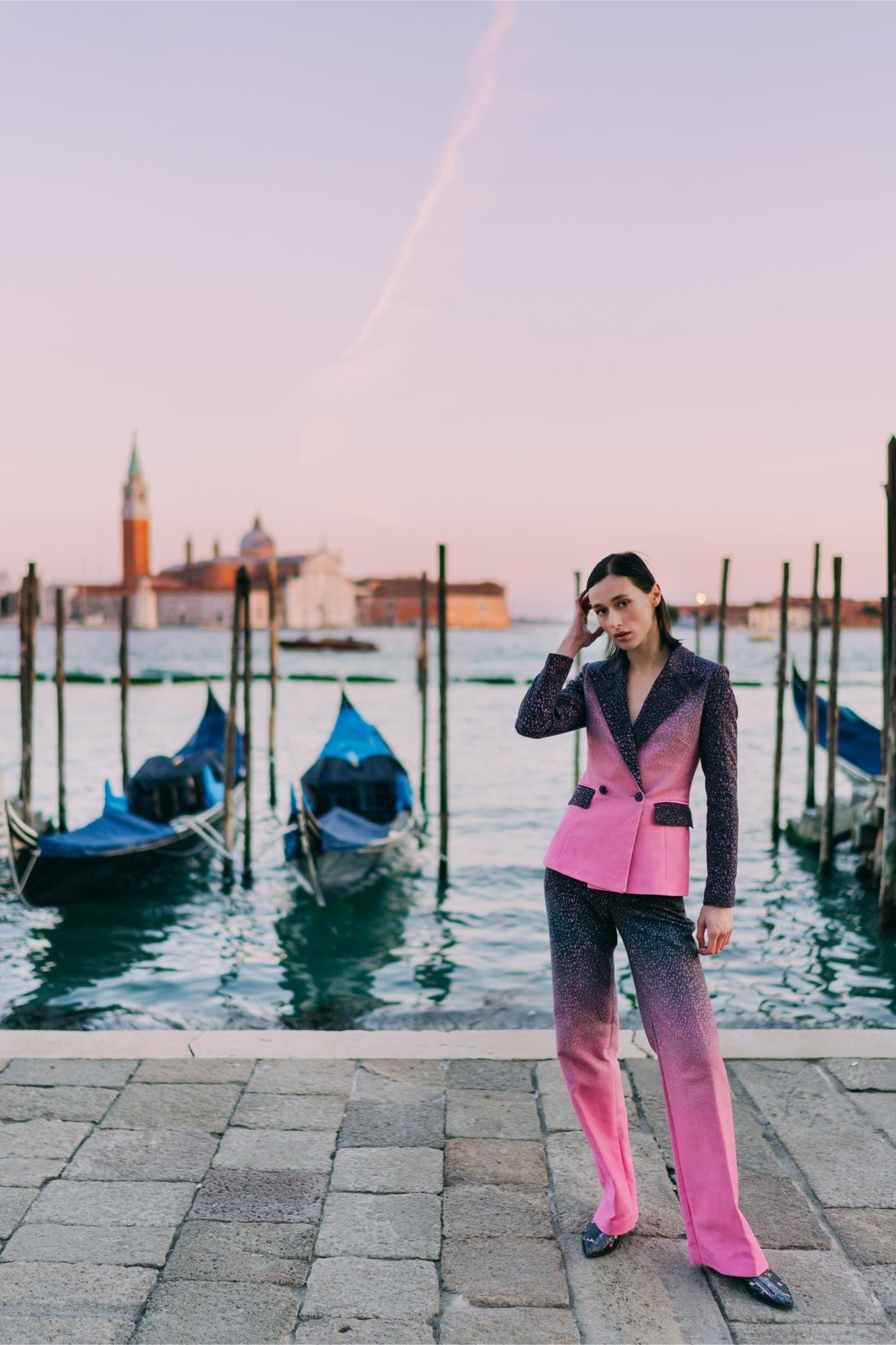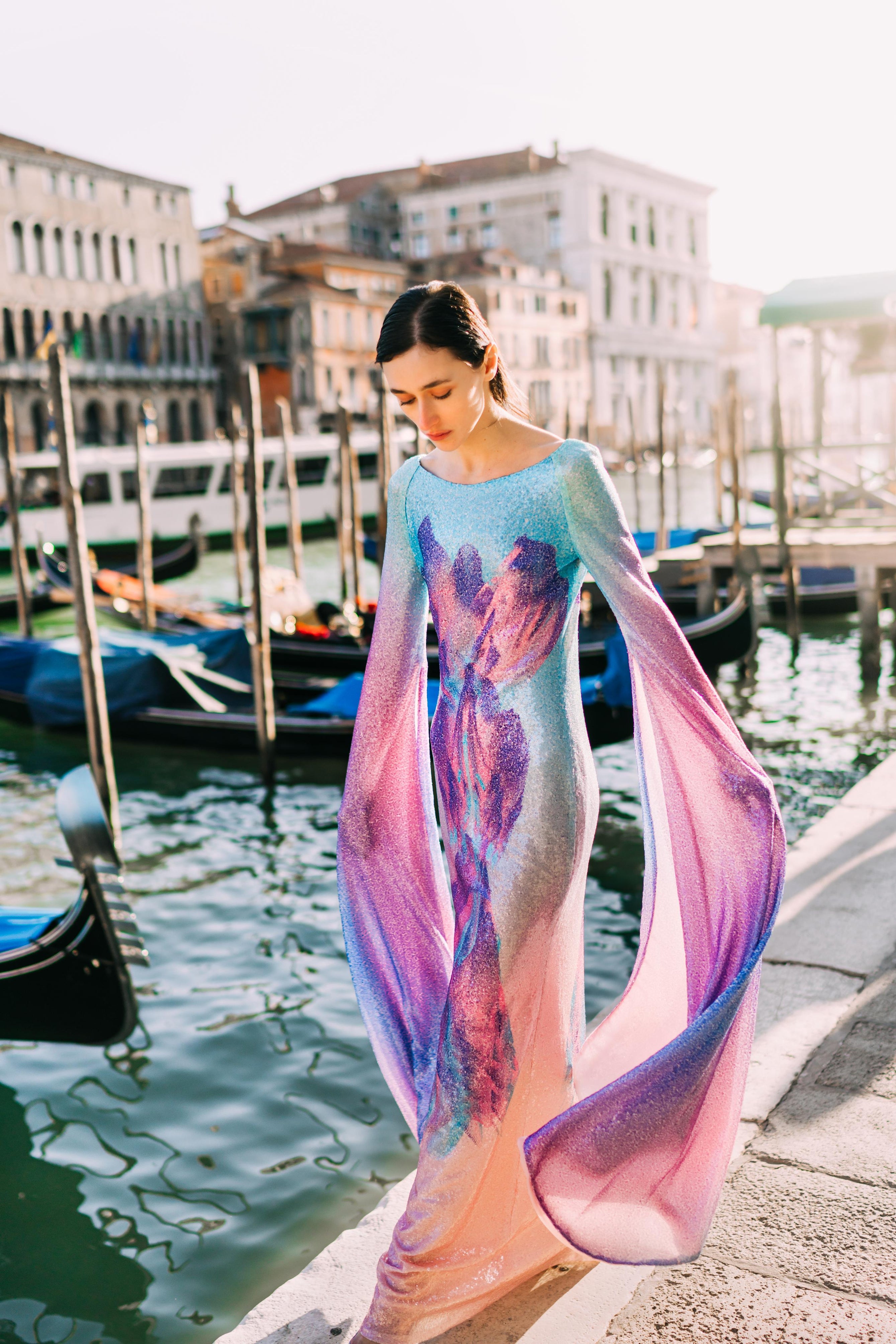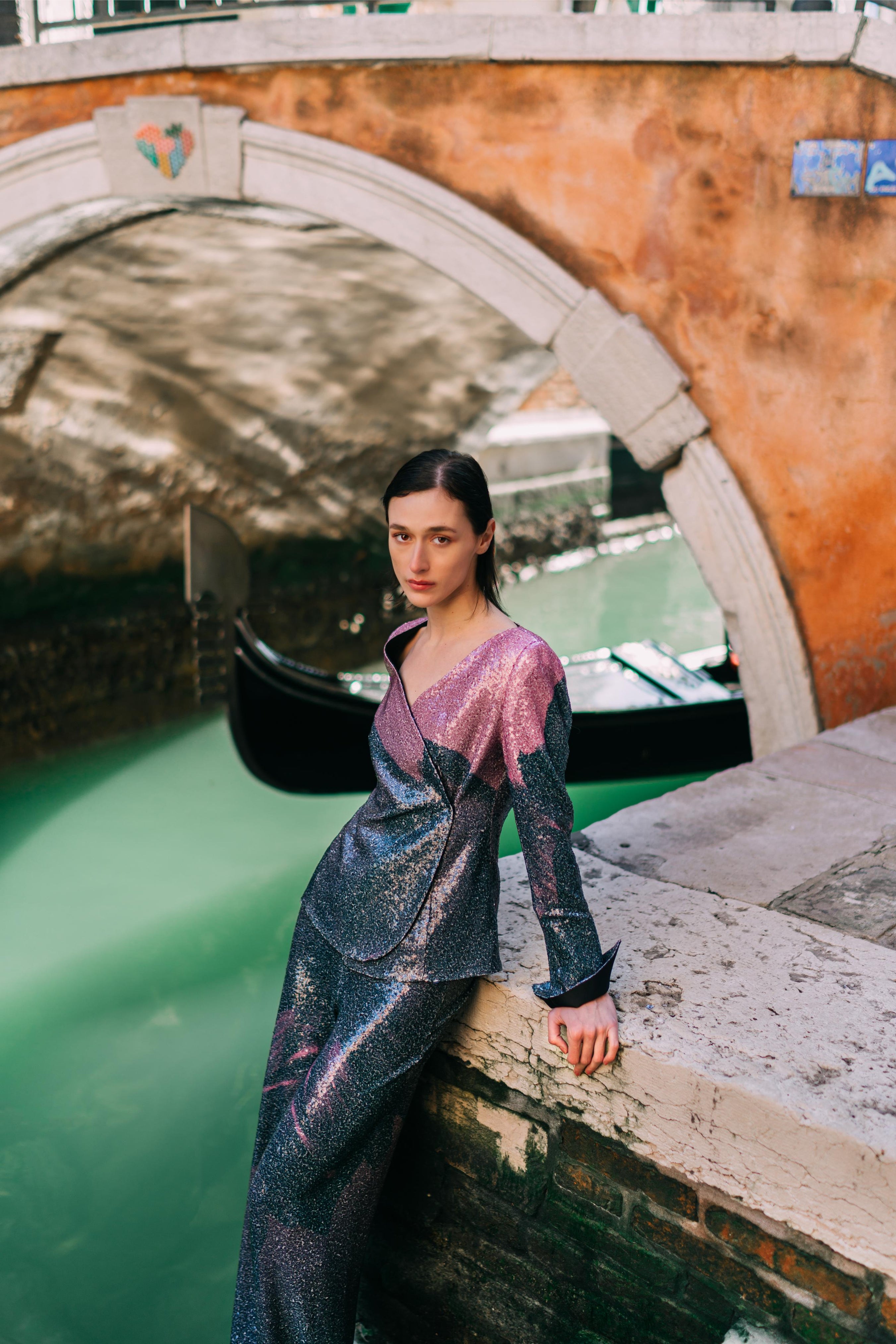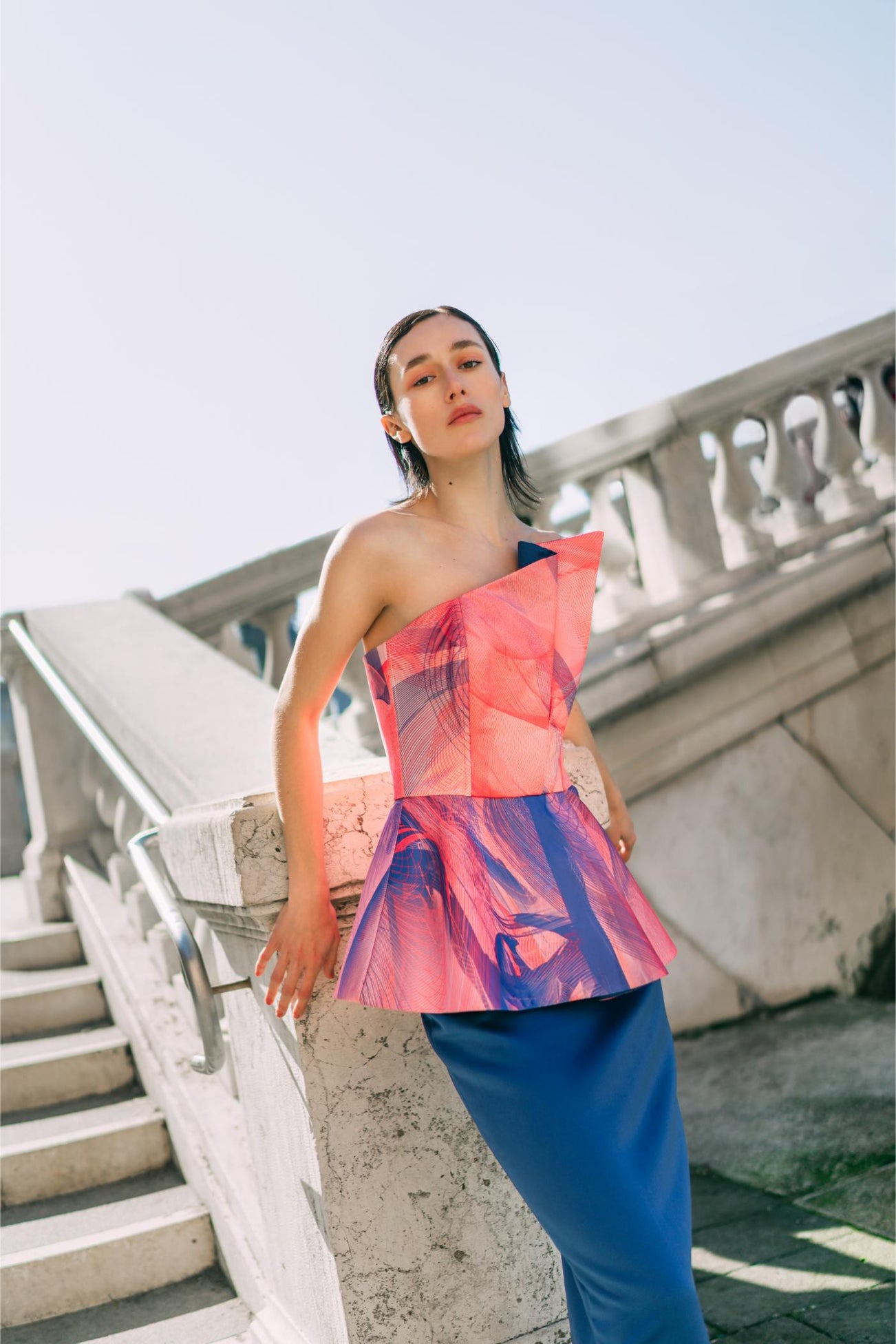 Inspired by the astronomical twilight, Belma Tvico premiered her new custom-designed print in the Spring/Summer 2023 semi couture collection, photographed in Venice. Through her work, Belma Tvico continually reconstruct the past into the postmodern present. The unrestrained movement and natural shapes mold into a high fashion.