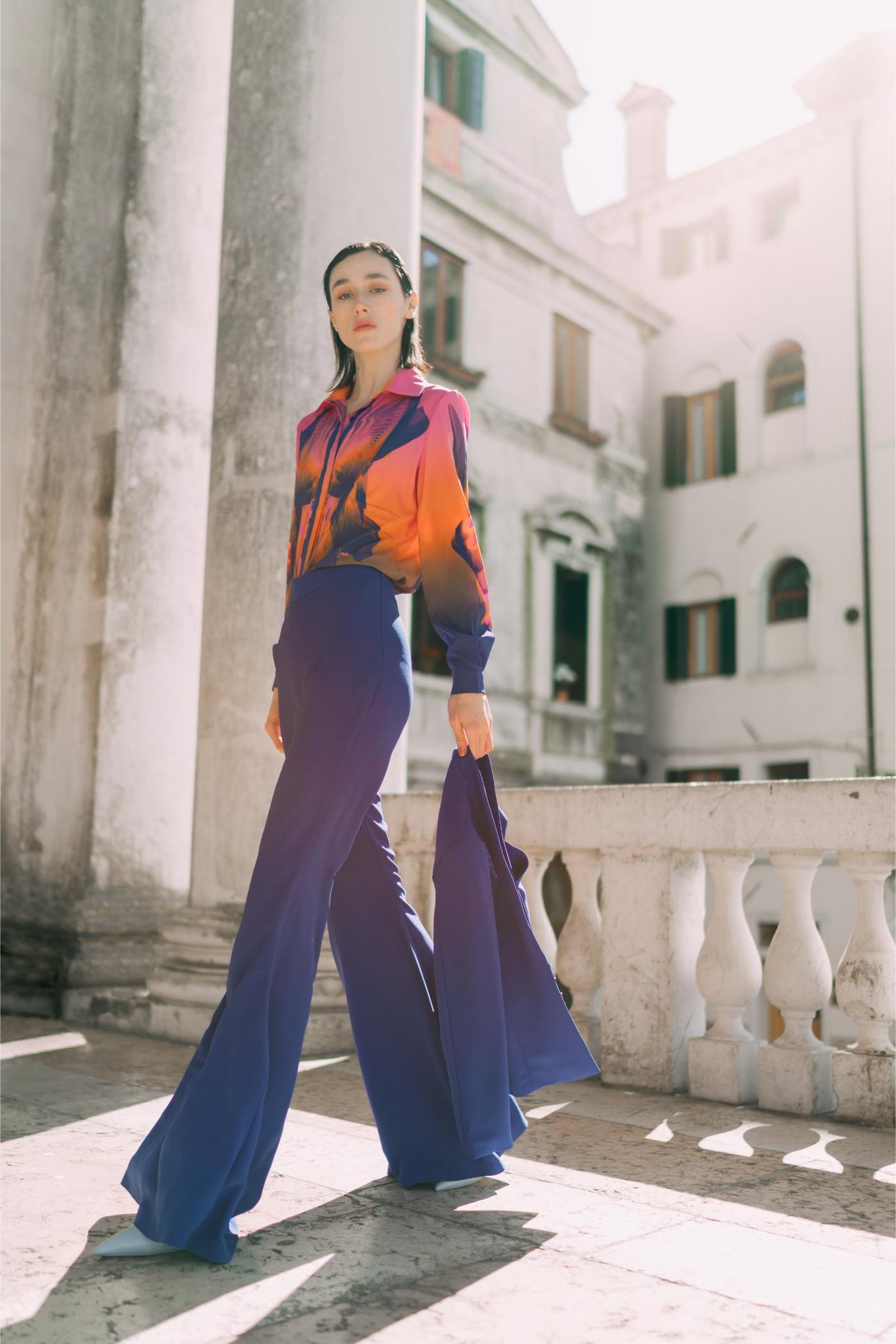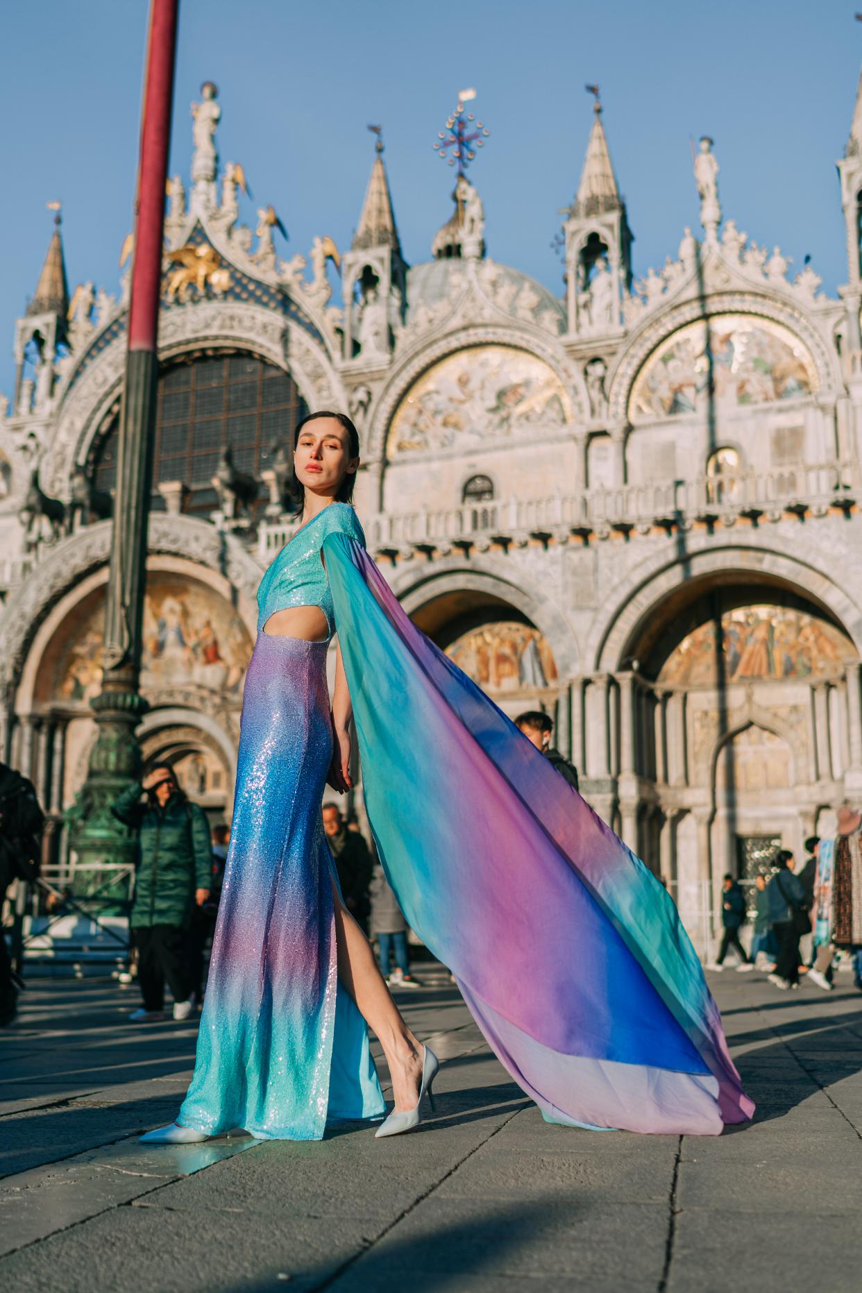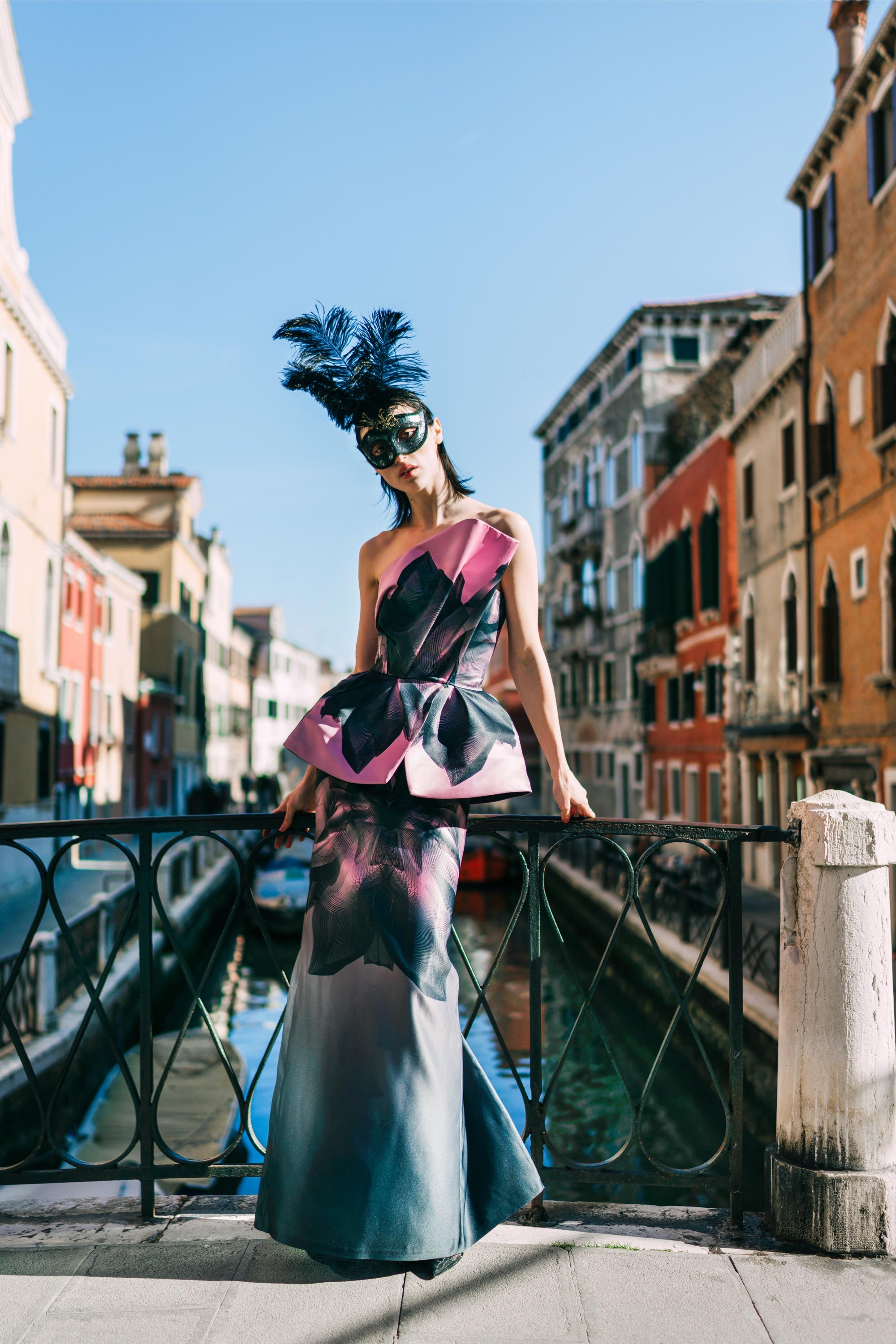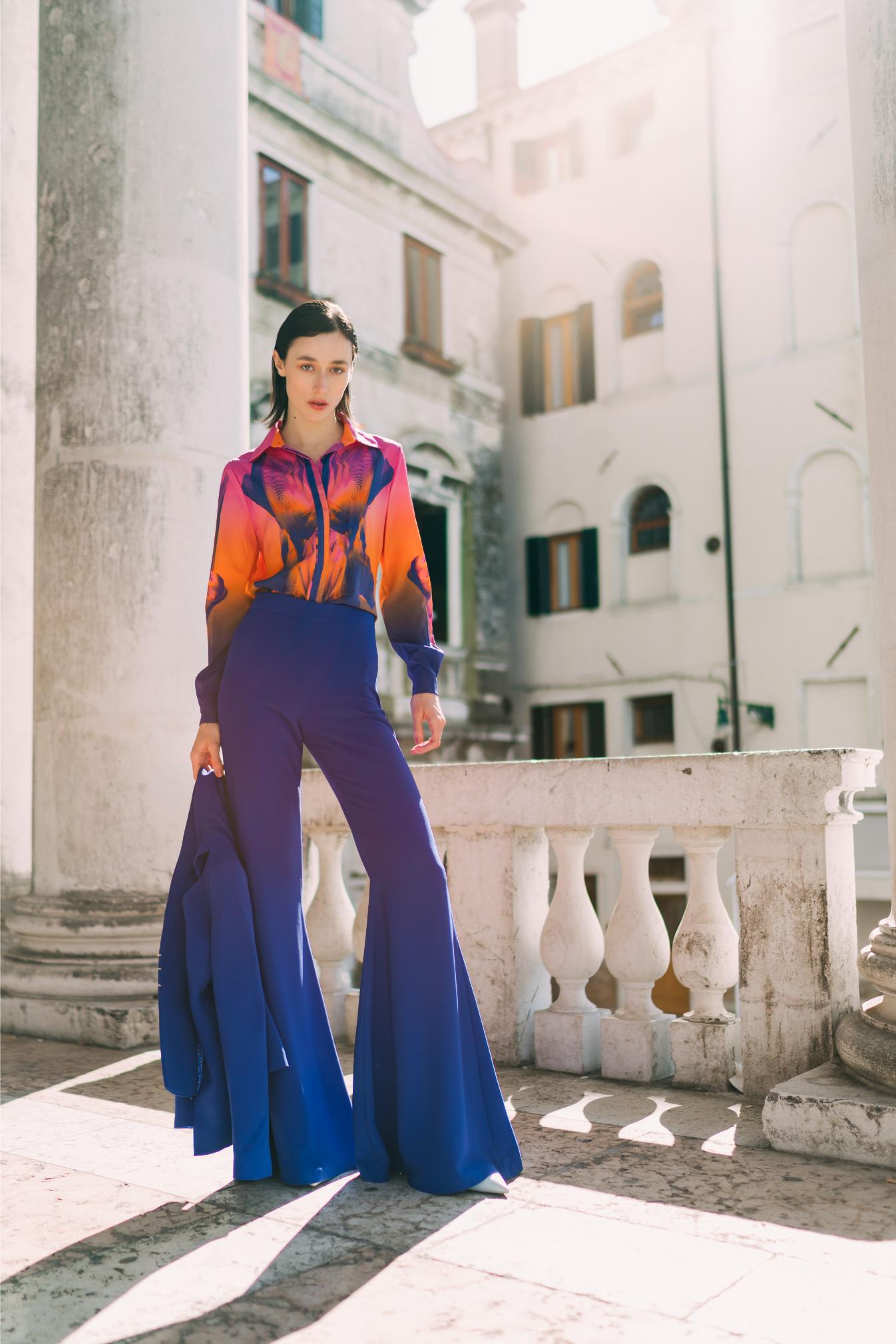Inspired by the astronomical twilight, Belma Tvico premiered her new custom-designed print in the Spring/Summer 2023 semi couture collection, photographed in Venice. Through her work, Belma Tvico continually reconstruct the past into the postmodern present. The unrestrained movement and natural shapes mold into a high fashion.