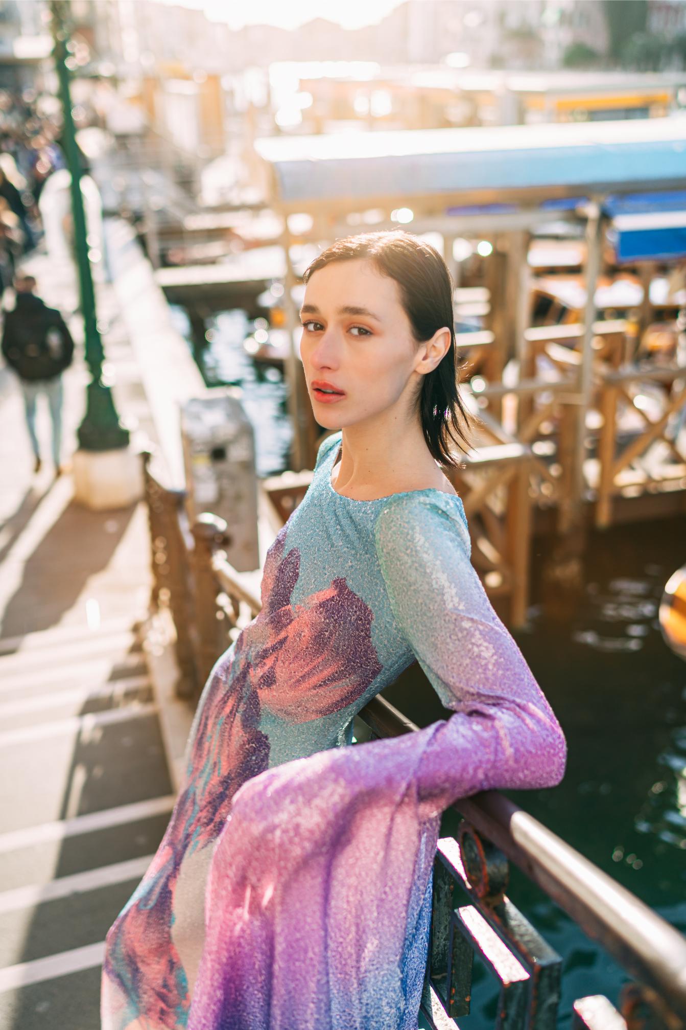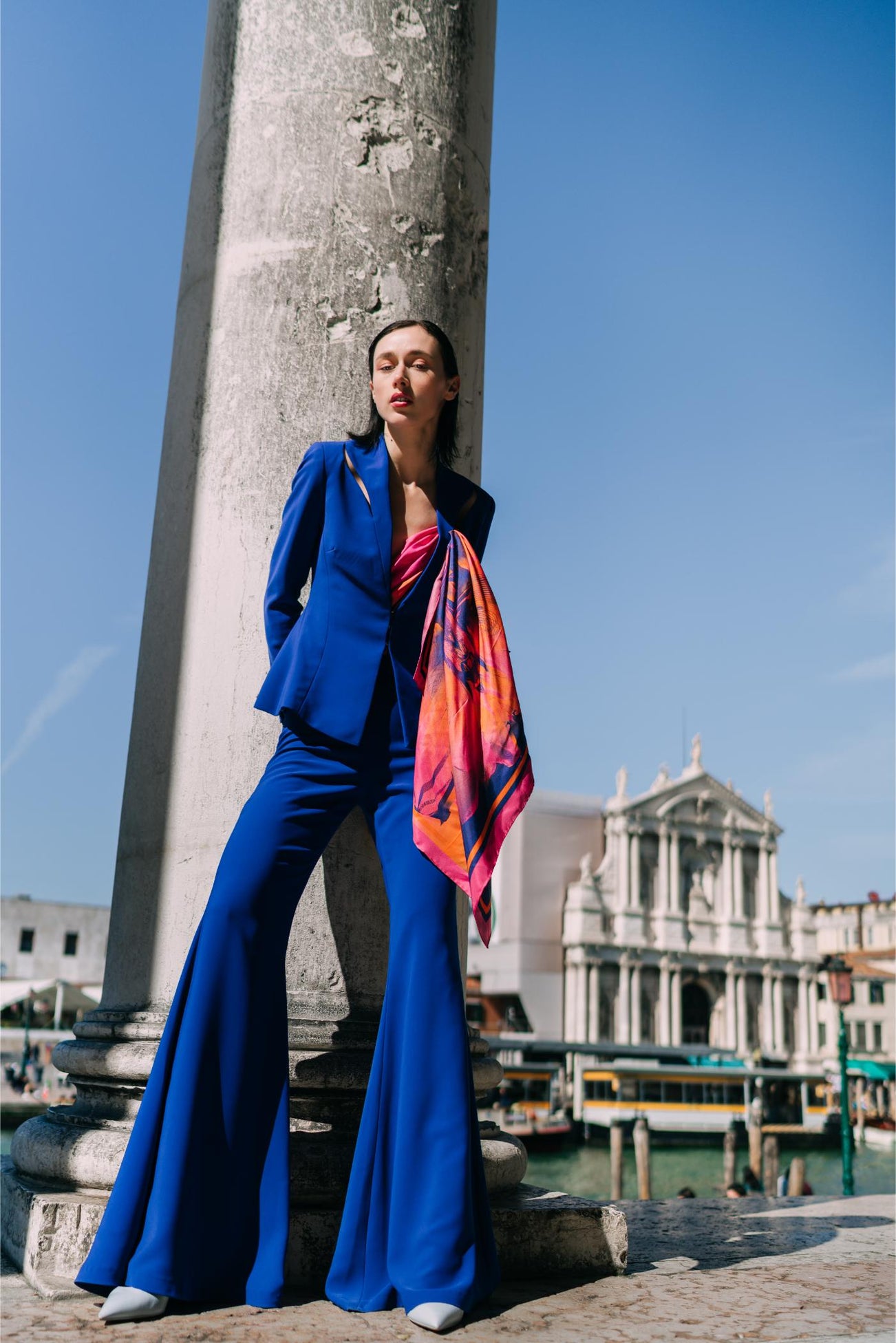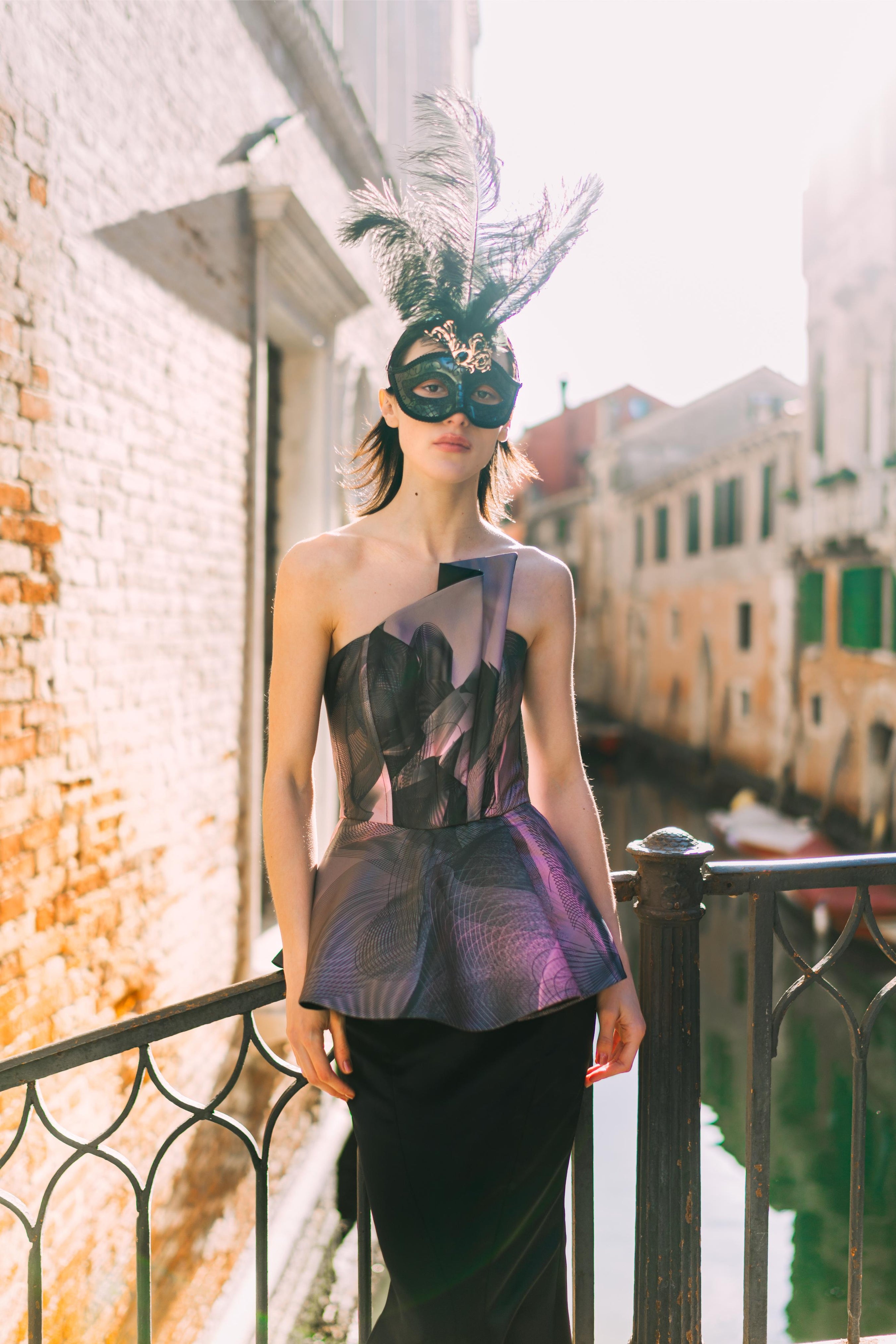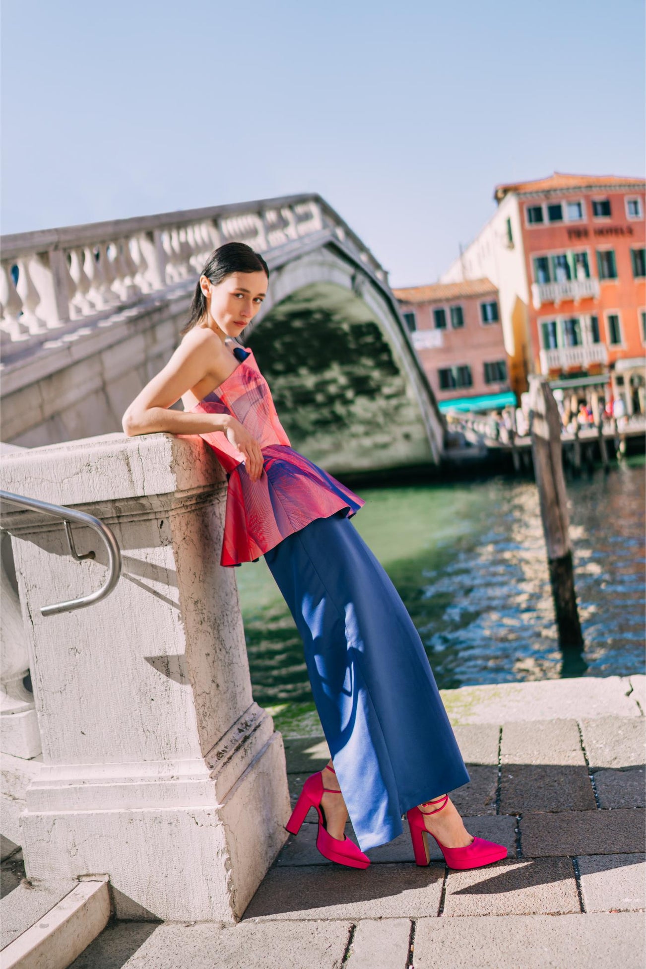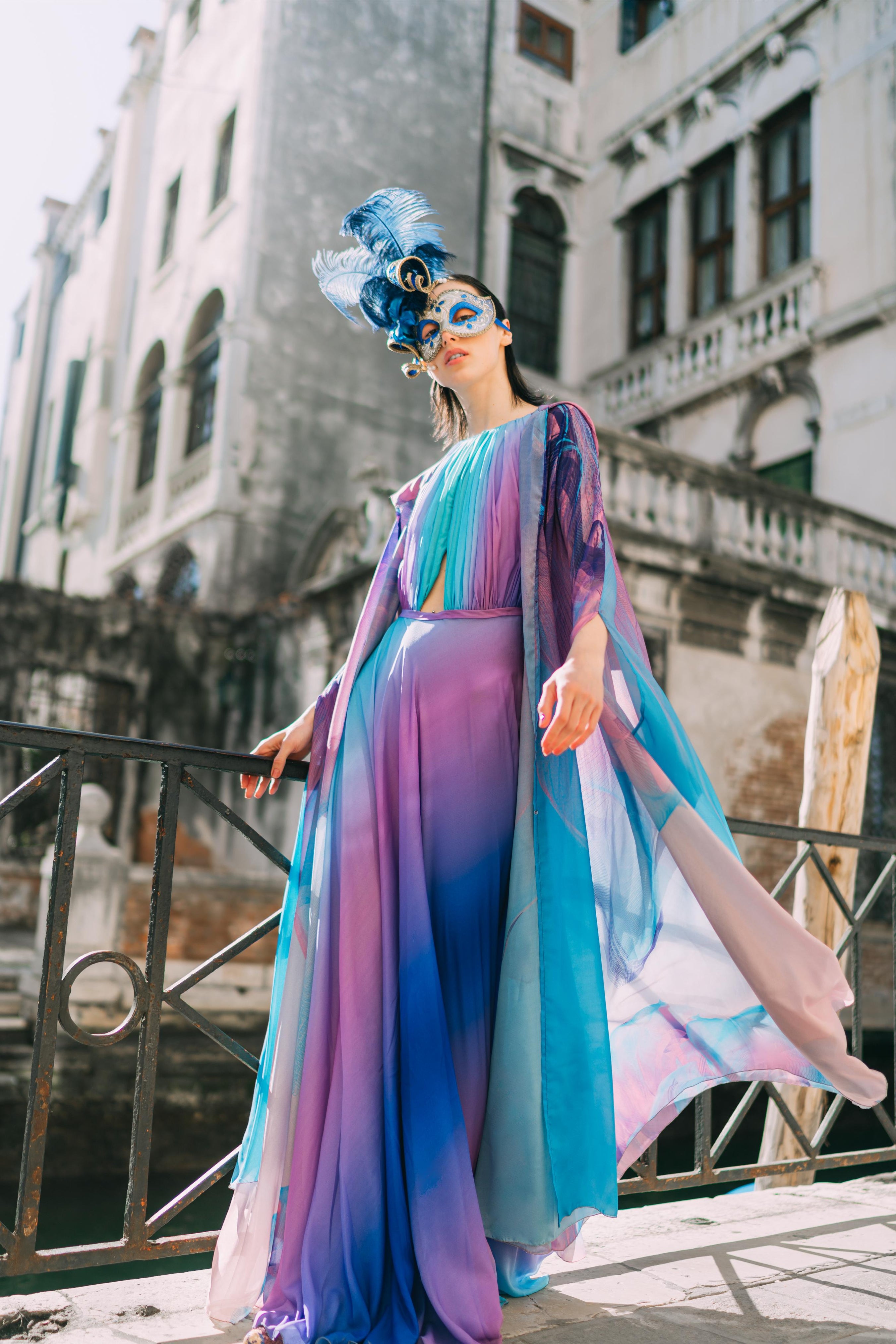 Inspired by the astronomical twilight, Belma Tvico premiered her new custom-designed print in the Spring/Summer 2023 semi couture collection, photographed in Venice. Through her work, Belma Tvico continually reconstruct the past into the postmodern present. The unrestrained movement and natural shapes mold into a high fashion.