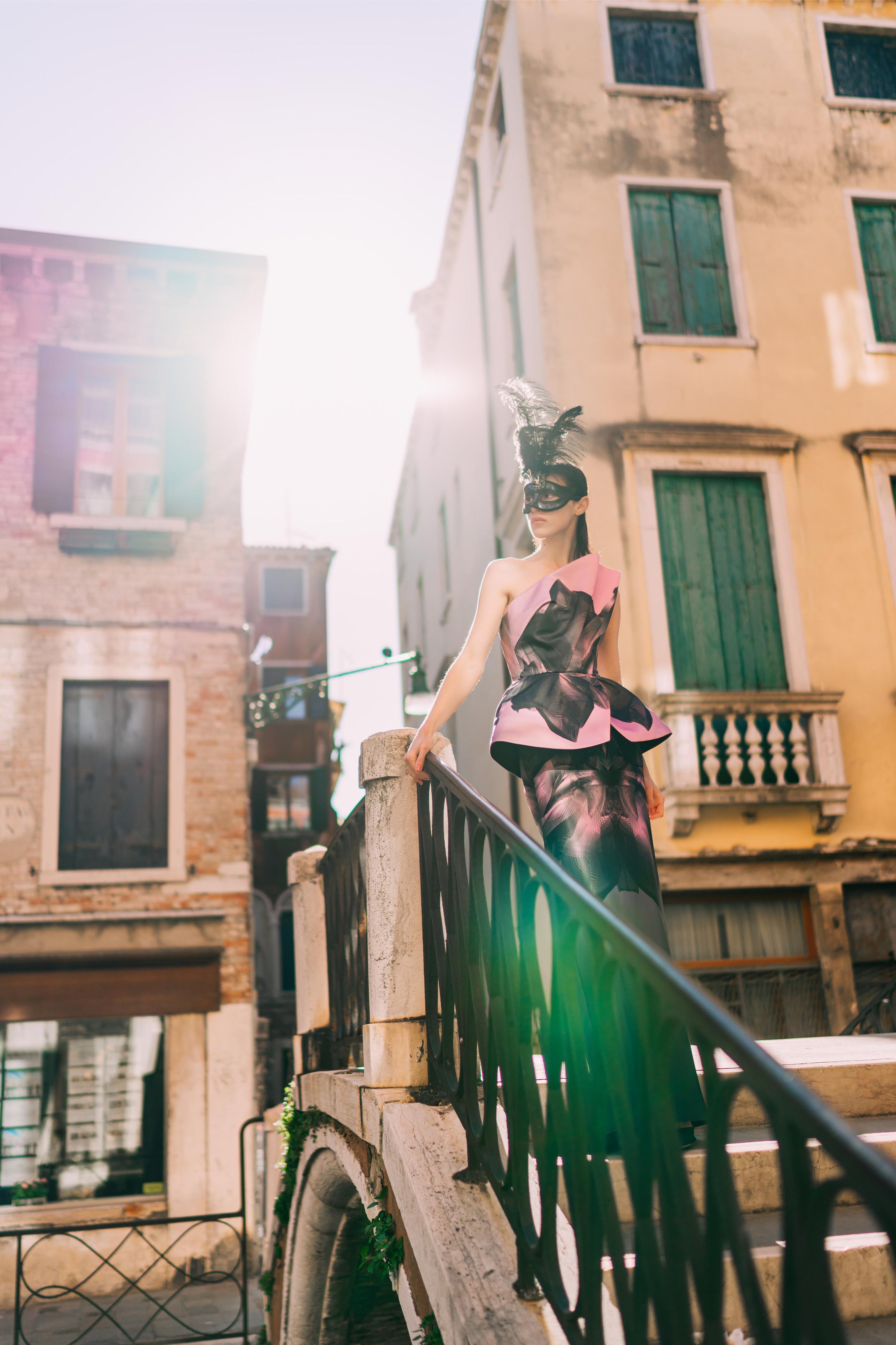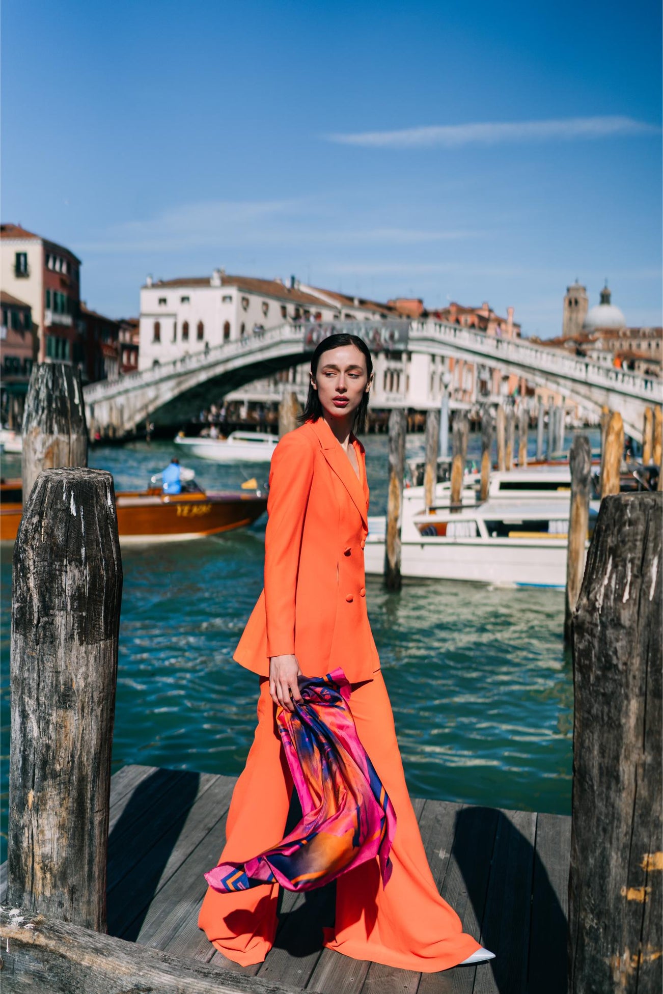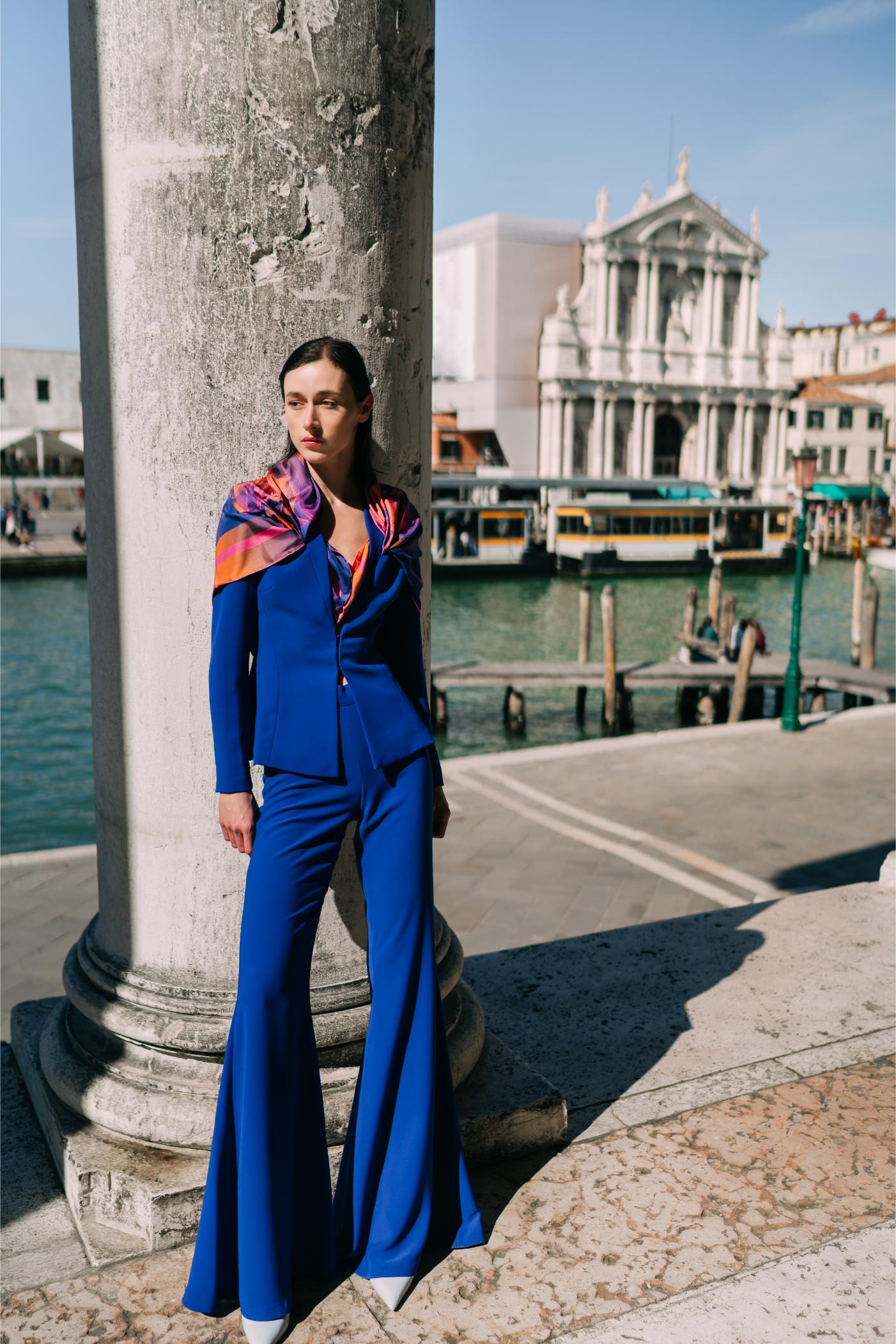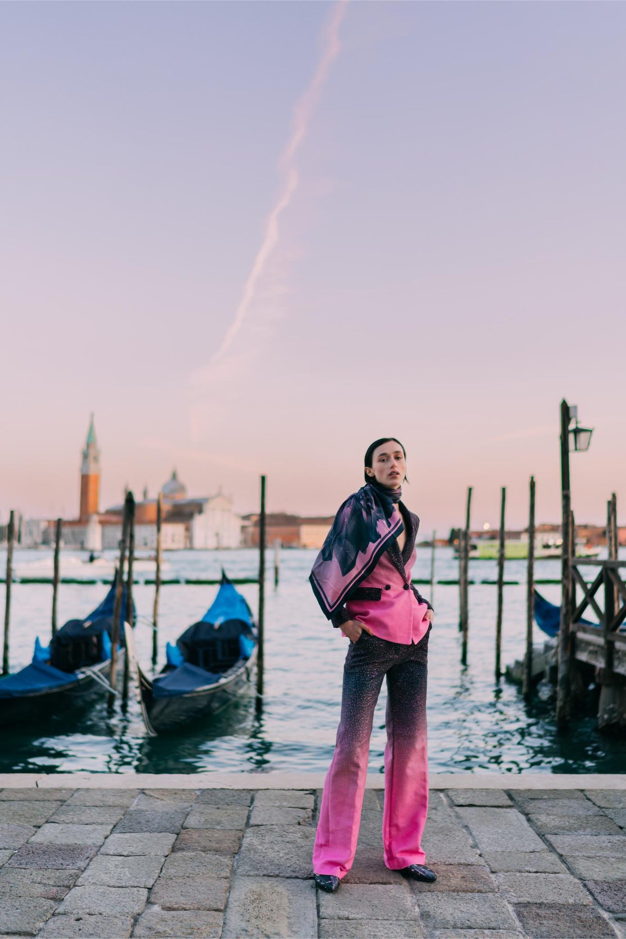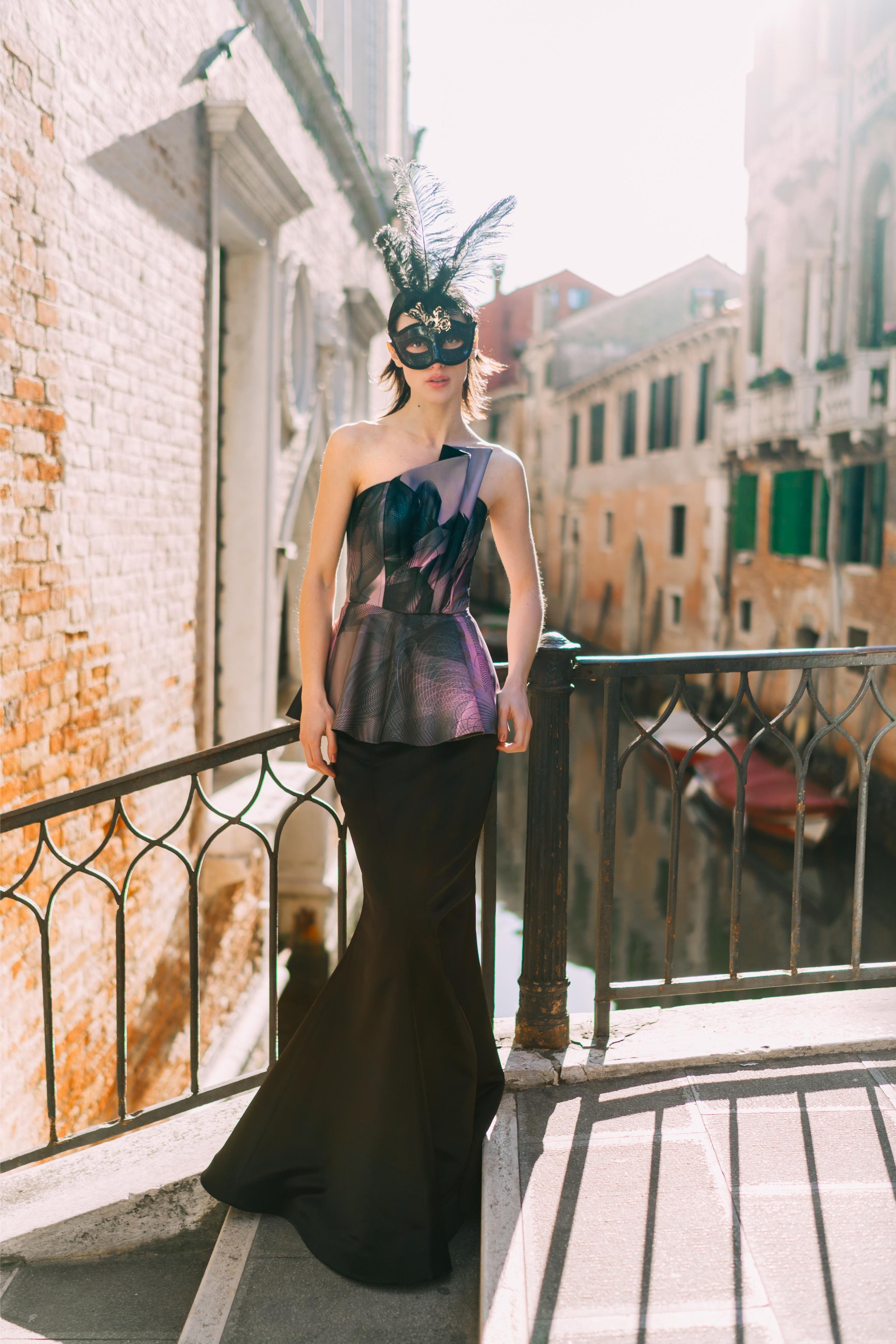 Inspired by the astronomical twilight, Belma Tvico premiered her new custom-designed print in the Spring/Summer 2023 semi couture collection, photographed in Venice. Through her work, Belma Tvico continually reconstruct the past into the postmodern present. The unrestrained movement and natural shapes mold into a high fashion.