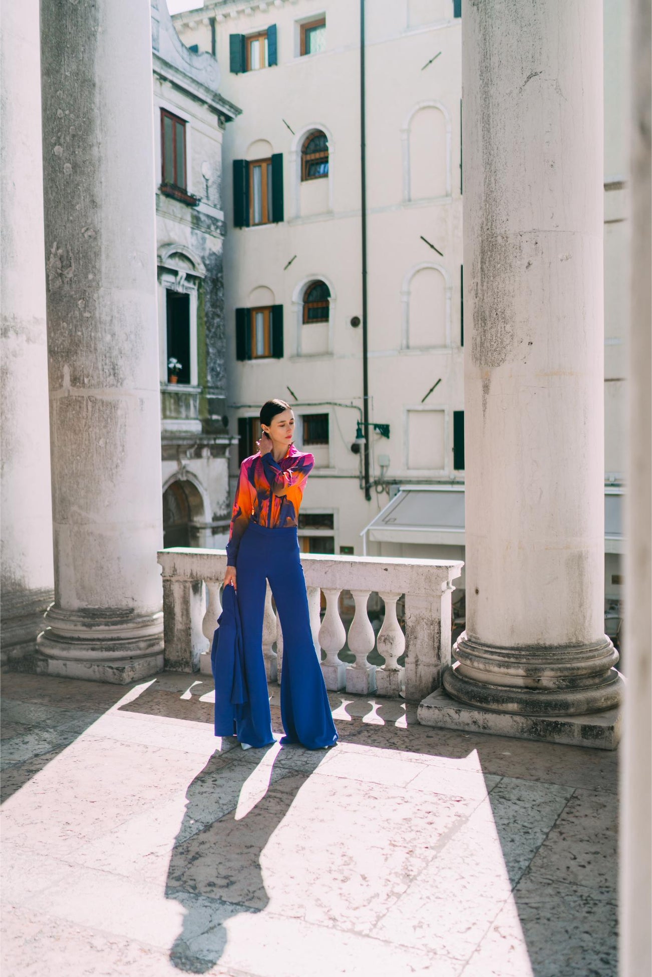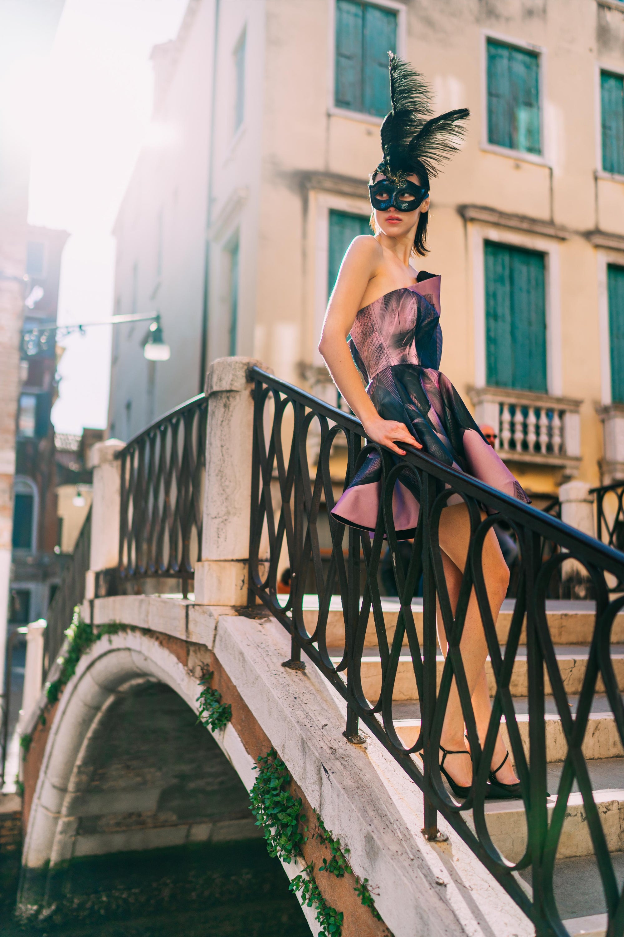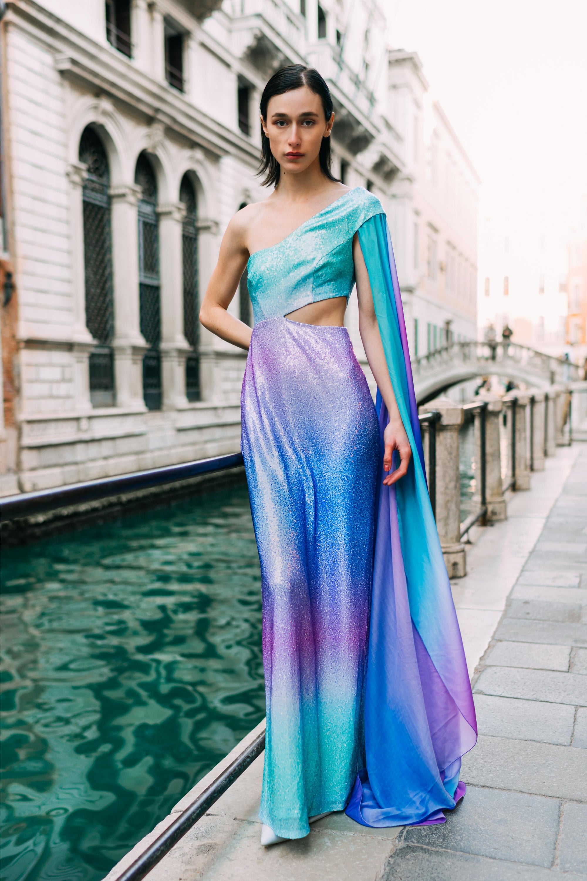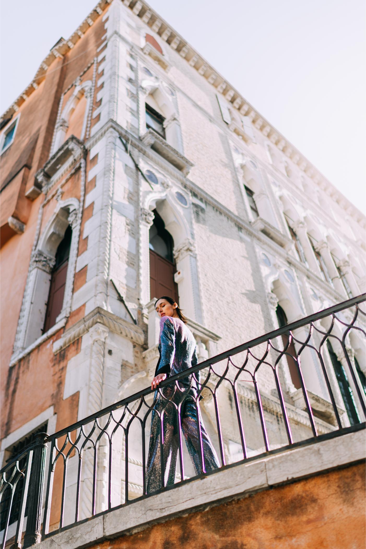 Inspired by the astronomical twilight, Belma Tvico premiered her new custom-designed print in the Spring/Summer 2023 semi couture collection, photographed in Venice. Through her work, Belma Tvico continually reconstruct the past into the postmodern present. The unrestrained movement and natural shapes mold into a high fashion.