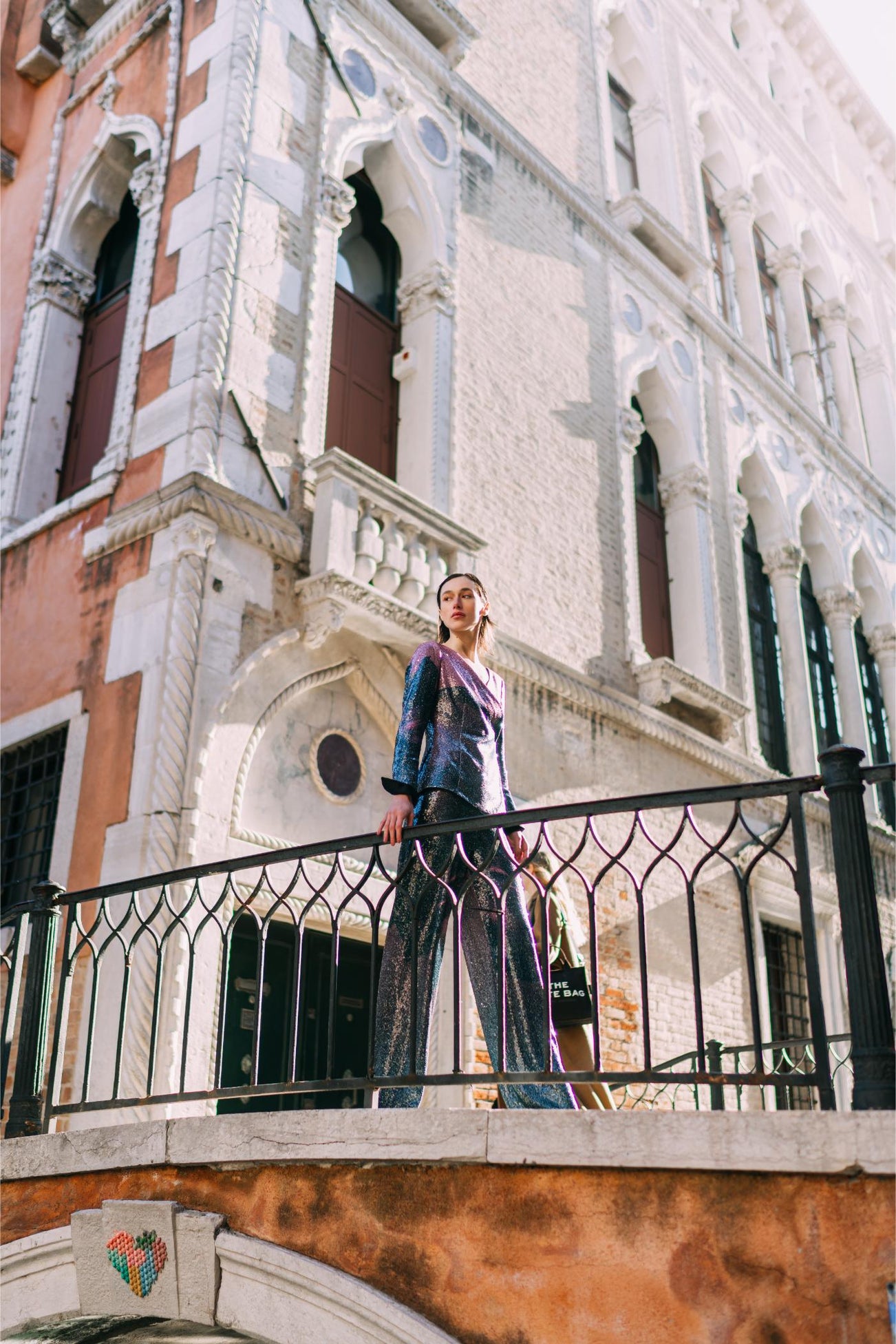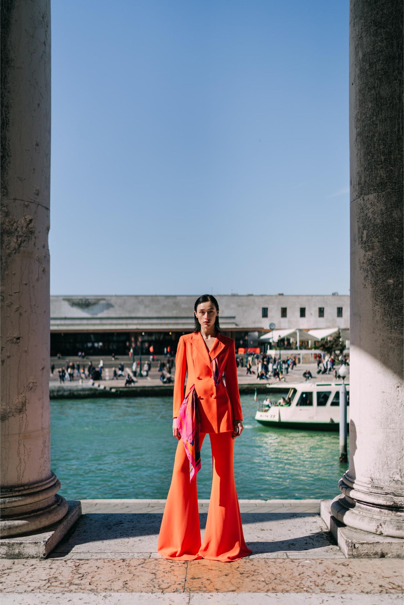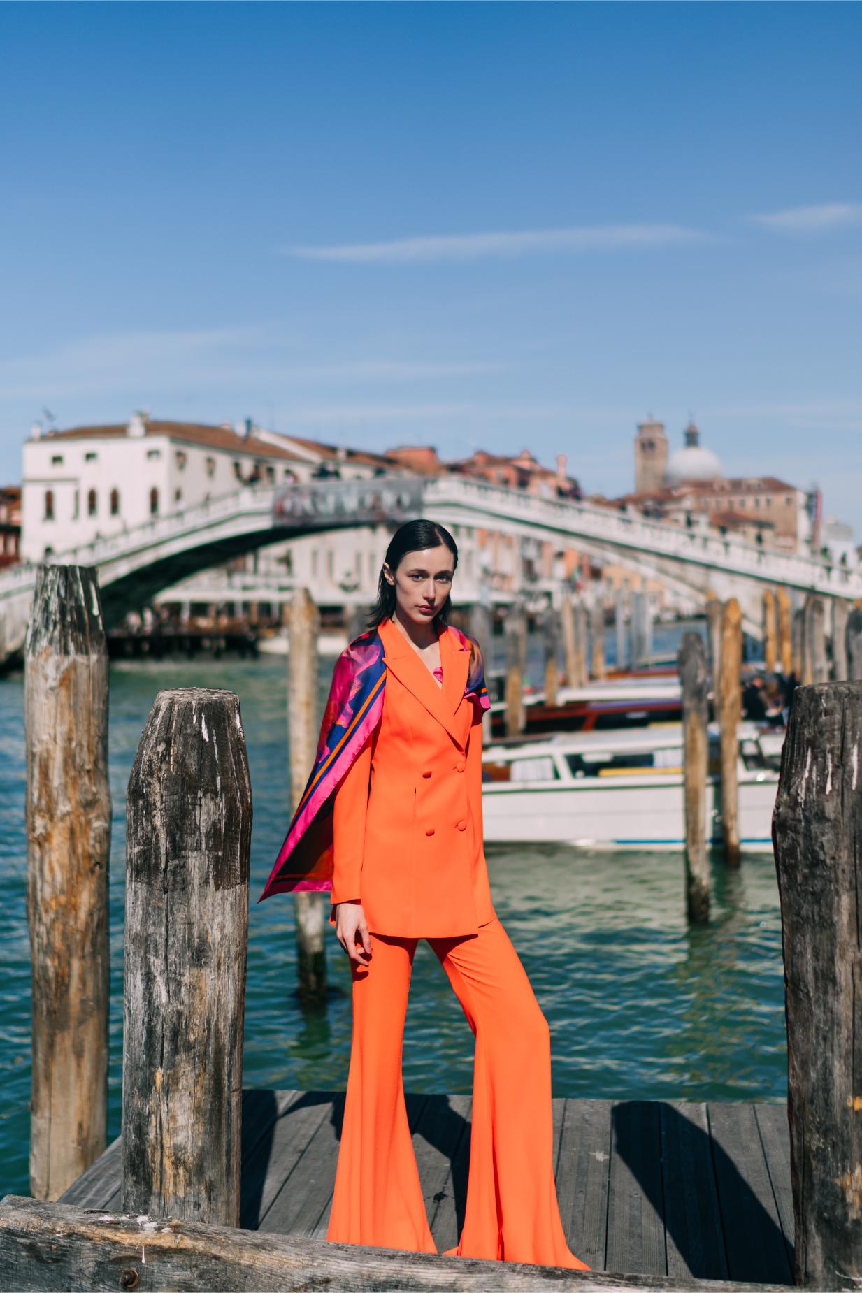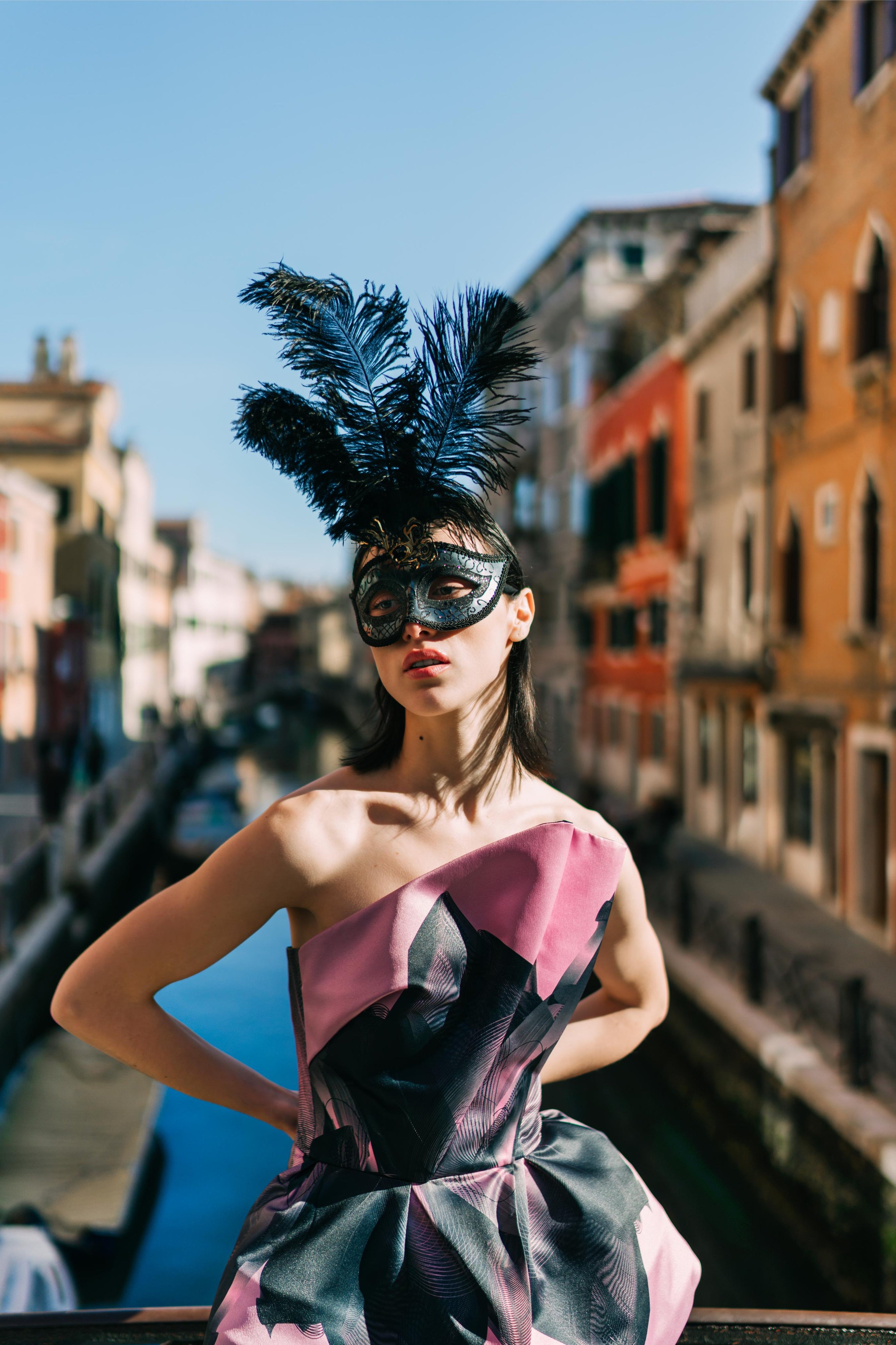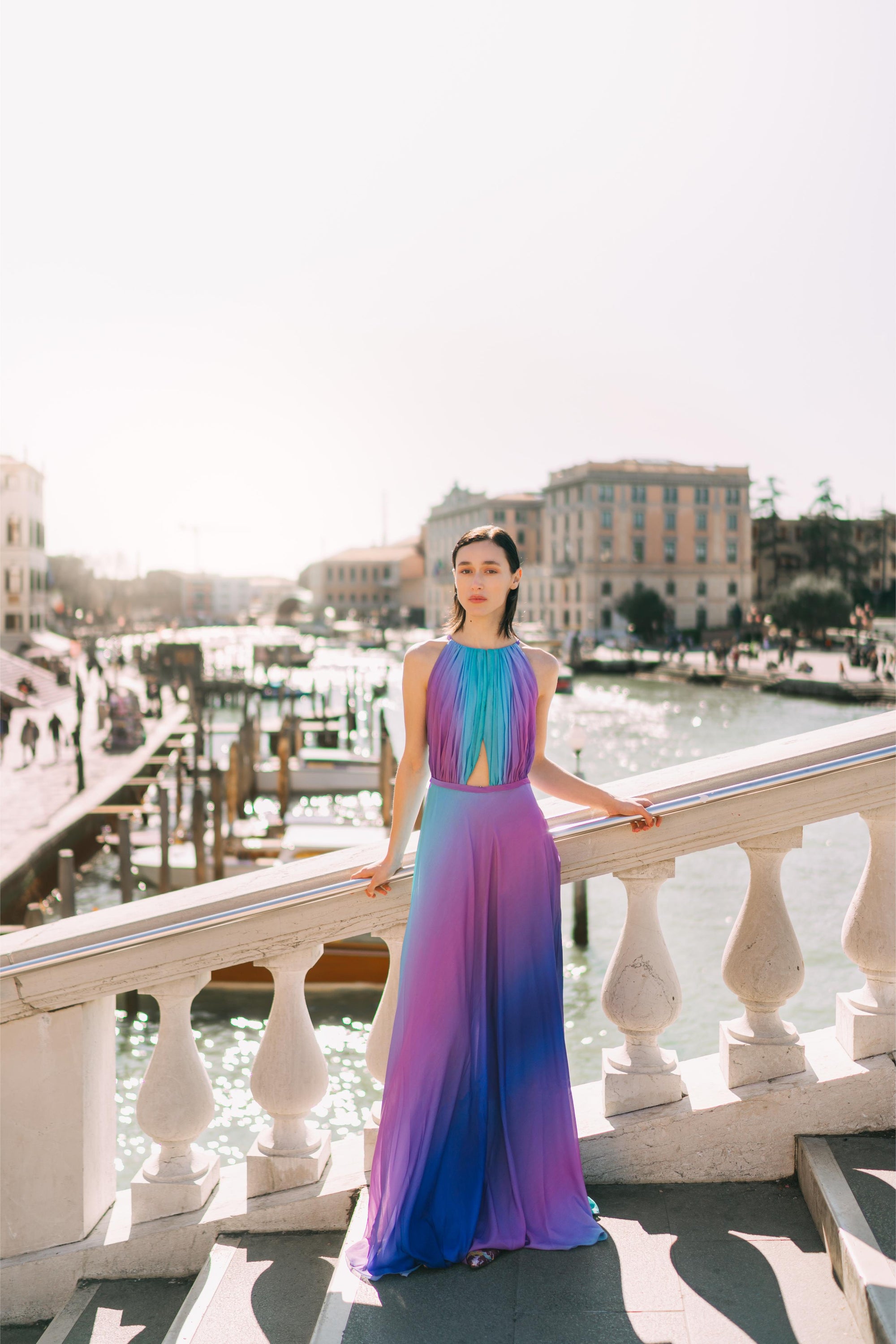 Inspired by the astronomical twilight, Belma Tvico premiered her new custom-designed print in the Spring/Summer 2023 semi couture collection, photographed in Venice. Through her work, Belma Tvico continually reconstruct the past into the postmodern present. The unrestrained movement and natural shapes mold into a high fashion.