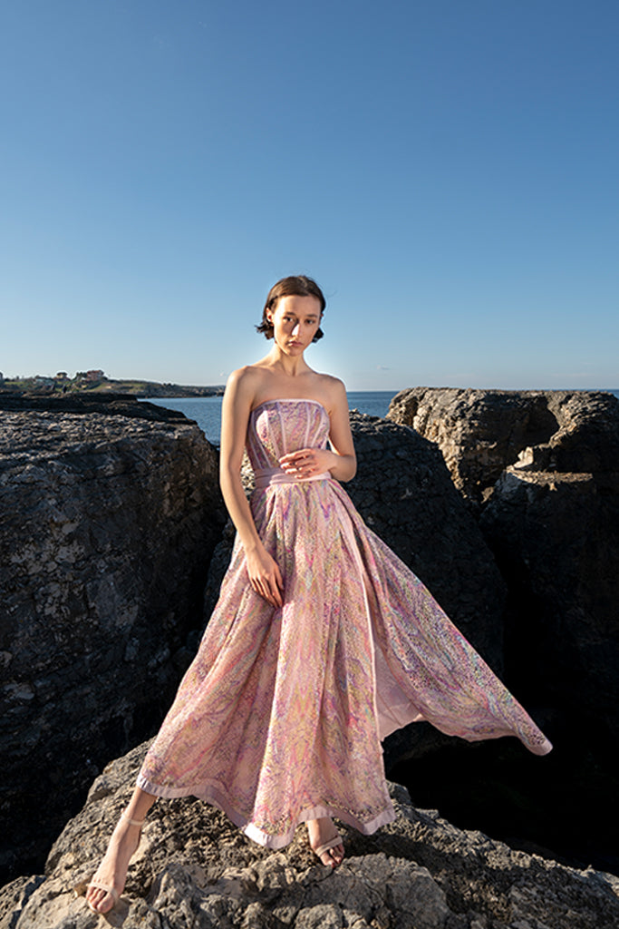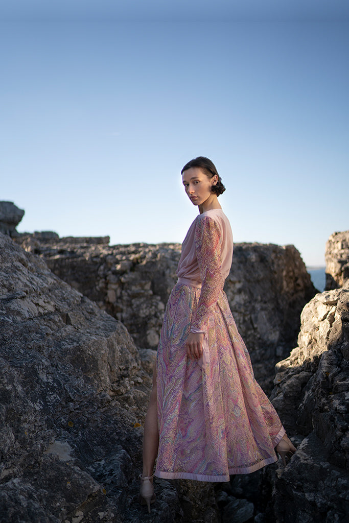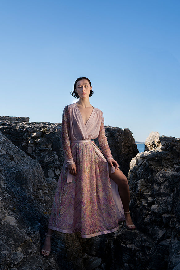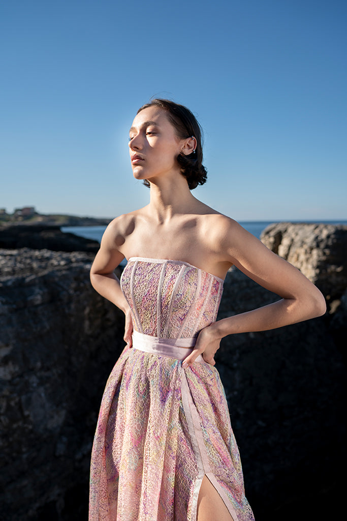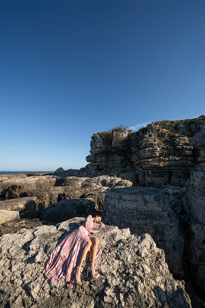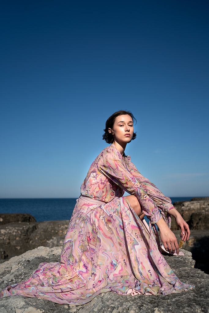 Belma Tvico Spring/Summer 2021 collection is focused on daintily printed dresses, ruffled separates, and dream-like classics. Strikingly chic in its simplicity, the collection celebrates Joy. The designer’s unique creative vision can be read into the clothes, but the most instructive clue to decoding it comes from blossoming of traditional shapes of Bosančica, the medieval Bosnian alphabet that acts as a connecting thread throughout her work.