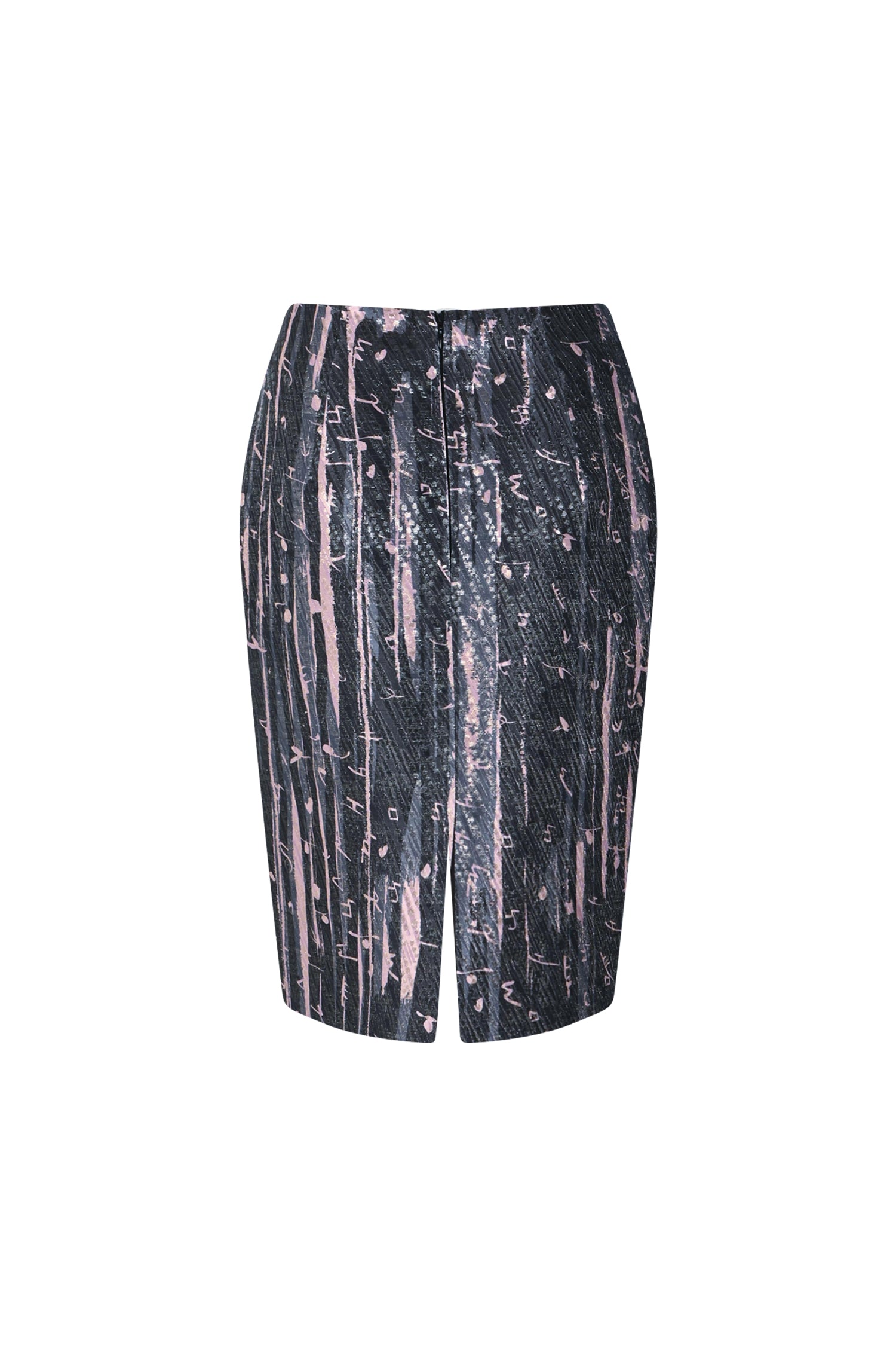 Elegant and richly detailed, the Grey Multicolor Brocade Bosančica Knee Length Skirt is a timeless piece that celebrates heritage and craftsmanship. This knee-length pencil skirt is designed to sit at the waist and offers a flattering, structured silhouette. Crafted from mid-weight, non-stretchy brocade fabric, it showcases intricate multicolor patterns inspired by Bosančica script, adding a unique cultural touch.
