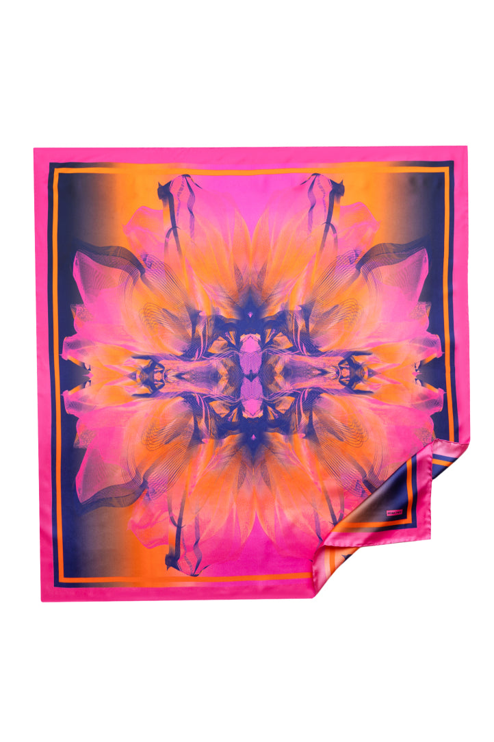 Every sunset is a sunrise, embodying life's duality and endless possibilities. Inspired by the Hesperides, Belma Tvico's Coral Sunset silk scarf revives the myth of the nymphs of the West and the golden magic of sunsets. Depicted as graceful maidens draped in ethereal fabrics, they symbolize purity, grace, and emotion. The scarf's vibrant palette—magenta, coral, flamingo, fiery rose, and ruby—framed by Tyrian purple, mirrors a celestial sunset. This exquisite accessory radiates beauty, joy, and elegance.