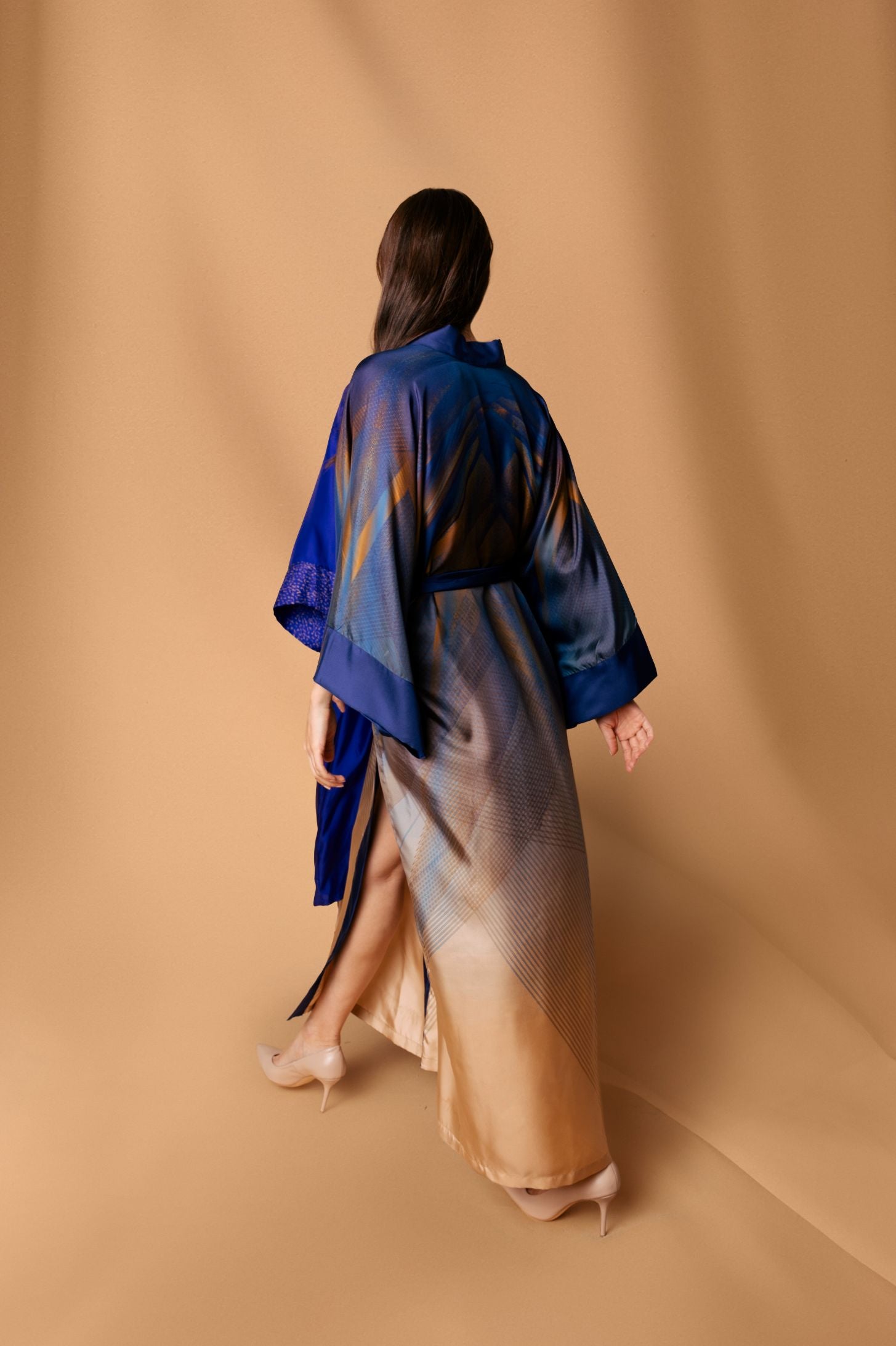 Made from luxurious multicolour silk twill, our kimono dress features a chic belt to cinch the waist, creating a perfectly tailored silhouette. Ideal for any occasion, this dress is your go-to for refined, effortless style.