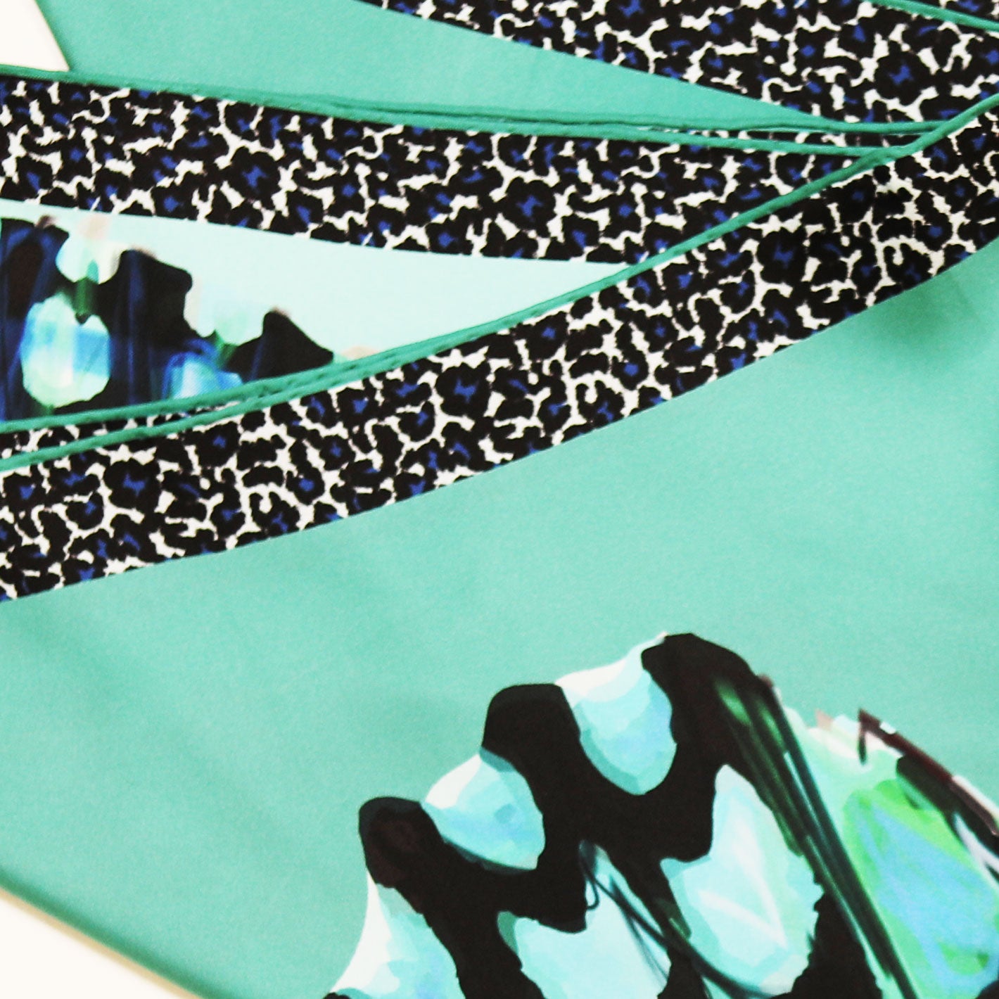 This Mariposa silk scarf features a striking butterfly motif in shades of turquoise, teal, and black, creating a mesmerizing, almost ethereal effect. The wings are intricately detailed, with abstract patterns that blend fluidly, giving the impression of a hand-painted or digitally enhanced artistic design. A bold, leopard-print-inspired border frames the piece, adding a touch of contemporary flair. Accents of tiny butterflies in the corners subtly enhance the composition, making this scarf a true statement piece. Ideal for adding a sophisticated, nature-inspired touch to any outfit.