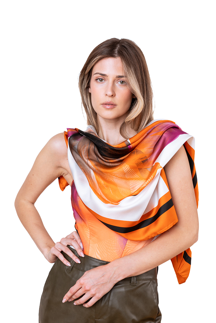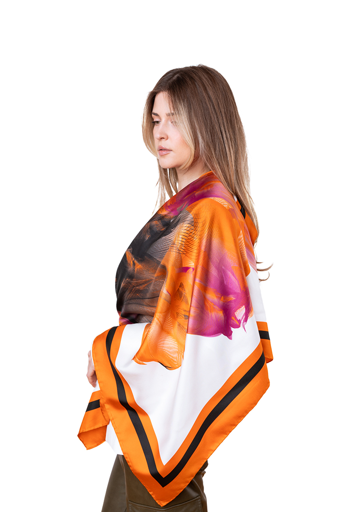 Vivid Orange Fuchsia Black Expanding Printed Silk Scarf
